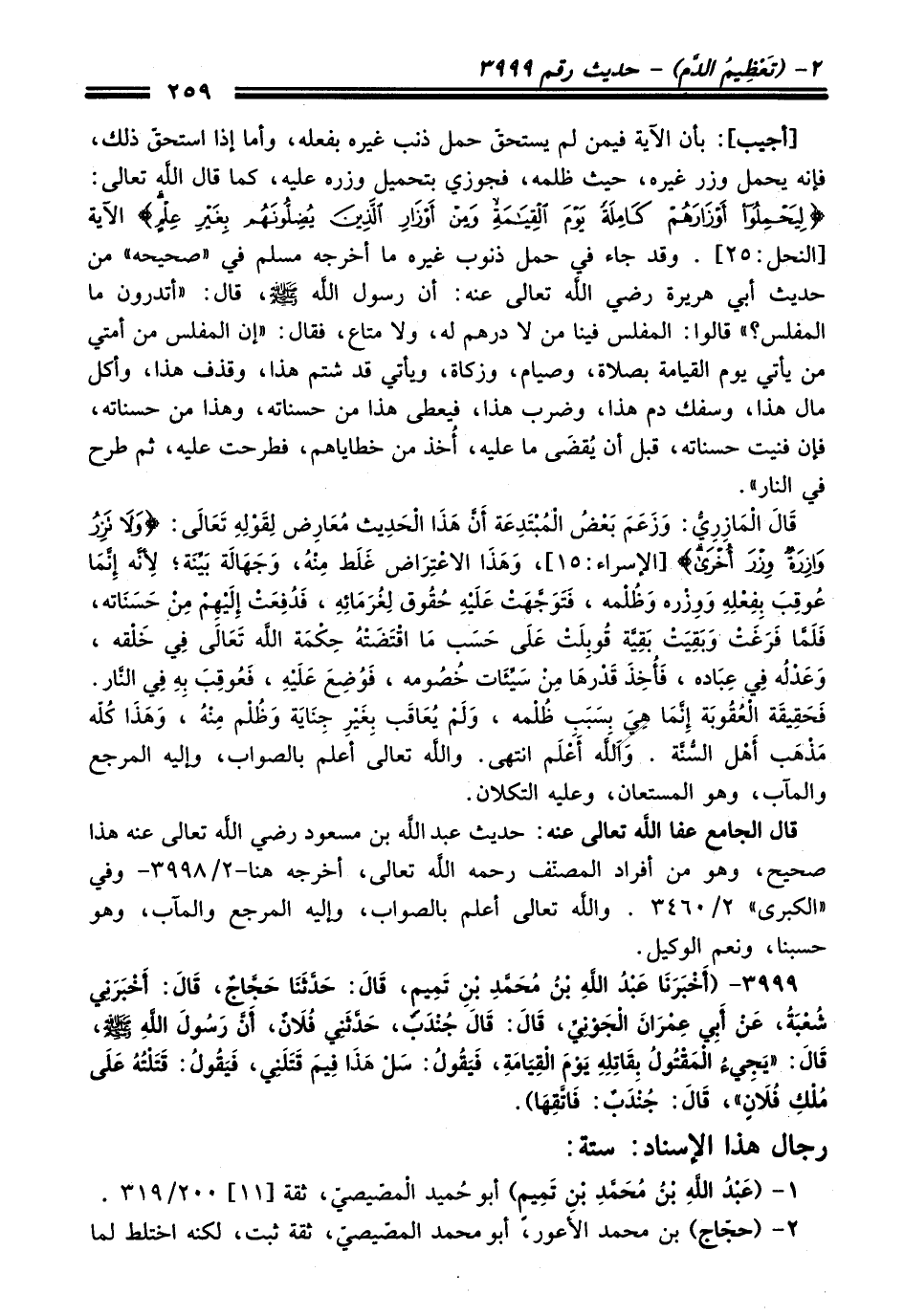 قَالَ: الْمَازرِيُّ: وَزَعَمَ بَعْضُ الْمُبْتَدِعَة أَنَّ هَذَا الْحَدِيث مُعَارِض لِقَوْلِهِ تَعَالَى: {وَلَا تَزِرُ وَازِرَةٌ وِزْرَ أُخْرَى} [الإسراء: 15]، وَهَذَا الاعتِرَاض غَلَط مِنْهُ، وَجَهَالَة بَيِّنَة؛ لِأنَّه إِنَّمَا عُوقِبَ بِفِعْلِهِ وَوِزْره وَظُلْمه، فَتَوَجَّهَت عَلَيْهِ حُقُوق لِغُرَمَائِهِ، فَدُفِعَتْ إِلَيْهِمْ مِنْ حَسَنَاته، فَلَمَّا فَرَغَت وَبَقِيَت بَقِيَّة قُوبِلَتْ عَلَى حَسَب مَا اقْتَضَتهُ حِكمَة اللَّه تَعَالَى فِي خَلْقه، وَعَدْلُه فِي عِبَاده، فَأُخِذَ قَدْرهَا من سَيِّئَات خُصُومه، فَوُضِعَ عَلَيْهِ، فَعُوقِبَ بِهِ فِي النَّار. فَحَقِيقَة العُقُوبَة إِنَّمَا هىَ بسَبَبِ ظُلمه، وَلَمْ يُعَاقَب بِغَيْرِ جِنَايَة وَظُلْم مِنْهُ، وَهَذَا كُلّه مَذهَب أَهل السُّنَّة. واللَّه أَعْلَم انتهى. واللَّه تعالى أعلم بالصواب، وإليه المرجع والمآب، وهو المستعان، وعليه التكلان.