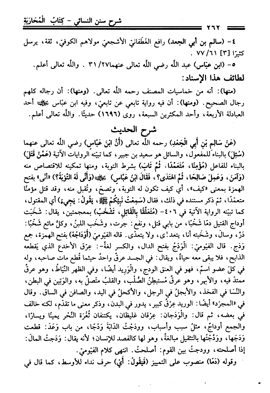 (عَنْ سَالِمِ بْنِ أَبِي الْجَعْدِ) -رحمه اللَّه تعالى- (أَنَّ ابْنَ عَبَّاسِ) - رضي اللَّه تعالى عنهما - (سُئِلَ) بالبناءَ للمفعول، والسائل هو سعيد بن جبير، كما تبيّنه الروايات الآتية (عَمَّنْ قَتَلَ) بالبناء للفاعل (مُؤْمِنًا، مُتَعَمِّدًا، ثمّ تَابَ) بشرط التوبة، ومنها تمكينه للاقتصاص منه (وَآمَنَ، وَعَمِلَ صَالِحًا، ثُمَّ اهْتَدَى؟، فَقَالَ ابْنُ عَبَّاسٍ) - رضي اللَّه عنهما - (وَأَنَّى لَهُ التَّوْبَةُ؟) "أنى" بفتح الهمزة بمعنى "كيف"، أي كيف تكون له التوبة، وتصحّ، وتُقبل منه، وقد قتل مؤمنًا متعمّدًا، ثمّ ذكر مستنده في ذلك، فقال (سَمِعتُ نَبِيَّكُمْ - صلى اللَّه عليه وسلم -، يَقُولُ: يَجِيءُ) أي المقتول، كما تبيّنه الرواية الآتية في 406 - (مُتَعَلِّقا بِالْقَاتِلِ، تَشْخَبُ) بمعجمتين، يقال: شَخَبَت أوداج القتيل دمًا شَخْبًا، من بابي قتل، ونفع: جرت، وشَخَب اللبنُ، وكلُّ مائع شَخْبًا: دَرَّ، وسالَ، وشَخَبته أنا، يتعدّى، ولا يتعدّى. قاله الفيّوميّ (أَوْدَاجُهُ) بفتح الهمزة، جمع وَدَج. قال الفيّوميّ: الْوَدْجُ بفتح الدال، والكسر لغةٌ-: عِرْق الأخدع الذي يَقطعه الذابح، فلا يبقى معه حياةٌ، ويقال: في الجسد عرقٌ واحدٌ حيثما قُطع مات صاحبه، وله في كلّ عضو اسمٌ، فهو في العنق الودج، والْوَرِيد أيضًا، وفي الظهر النِّيَاطُ، وهو عرقٌ ممتدّ فيه، والأبهر، وهو عرقٌ مُستبطِنُ الصُّلْب، والقلبُ متّصلٌ به، والوَتِين في البطن، والنَّسَا في الفخذ، والأبجلُ في الرجل، والأكحلُ في اليد، والصافن في الساق. وقال في "المجرد" أيضًا: الوريد عِرْقٌ كبير، يدور في البدن، وذكر معنى ما تقدّم، لكنه خالف في بعضه، ثم قال: والْوَدَجان: عِرْقان غليظان، يكتنفان ثُغْرَة النحر يمينًا ويسارًا، والجمع أوداجٌ، مثلُ سبب وأسباب، وودَجْتُ الدّابّةَ وَدْجًا، من باب وَعَدَ: قطعت وَدَجَها، ووَدَّجْتُها بالتثقيل مبالغةٌ، وهو لها كالفصد للإنسان؛ لأنه يقال: وَدَجتُ المالَ: إذا أصلحته، وودجتُ بين القوم: أصلحتُ. انتهى كلام الفيّوميّ.