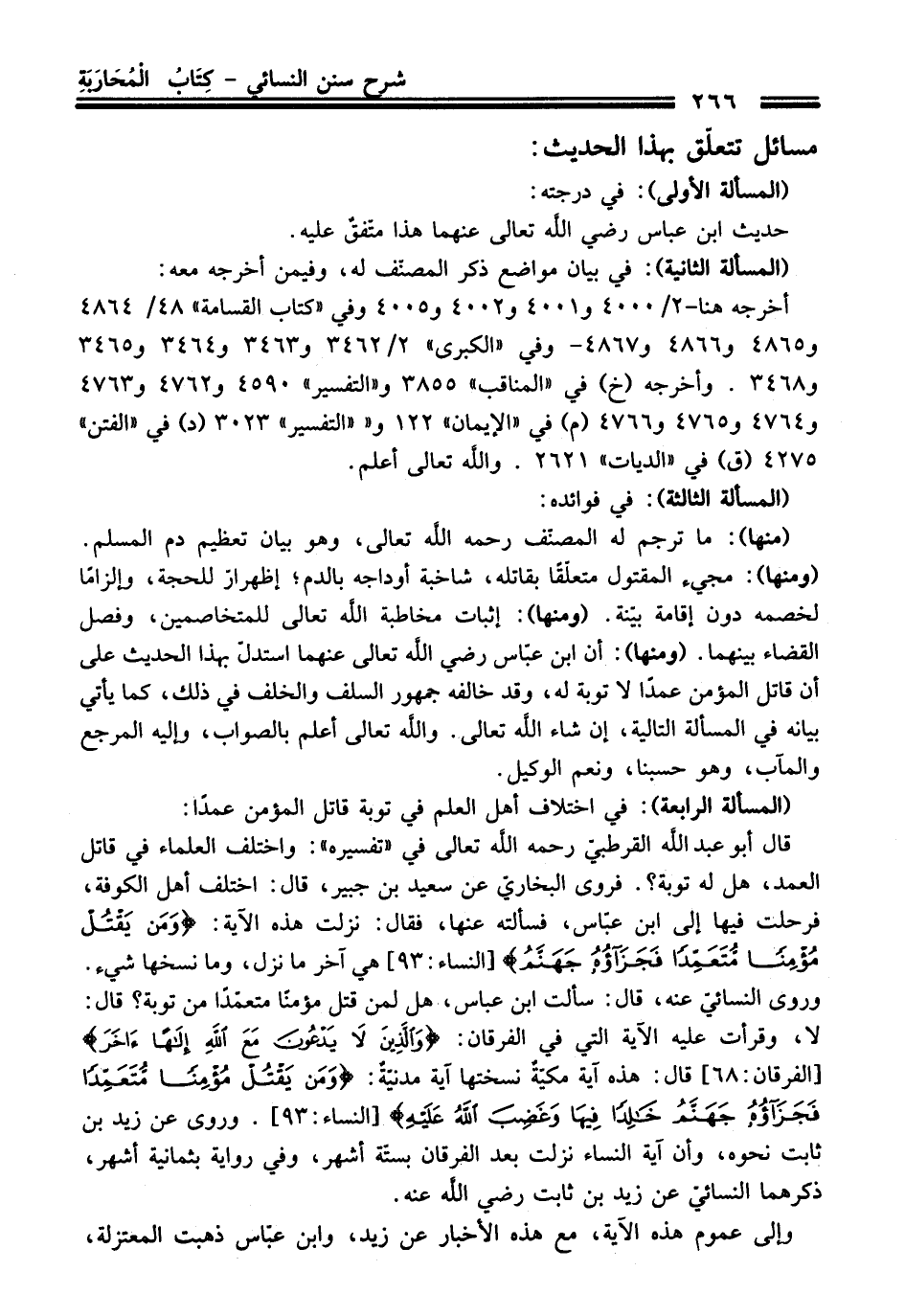قال أبو عبد اللَّه القرطبيّ -رحمه اللَّه تعالى- في "تفسيره": واختلف العلماء في قاتل العمد، هل له توبة؟. فروى البخاريّ عن سعيد بن جبير، قال: اختلف أهل الكوفة، فرحلت فيها إلى ابن عبّاس، فسألته عنها، فقال: نزلت هذه الآية: {وَمَنْ يَقْتُلْ مُؤْمِنًا مُتَعَمِّدًا فَجَزَاؤُهُ جَهَنَّمُ} [النساء: 93] هي آخر ما نزل، وما نسخها شيء. وروى النسائيّ عنه، قال: سألت ابن عبّاس، هل لمن قتل مؤمنًا متعمّدًا من توبة؟ قال: لا، وقرأت عليه الآية التي في الفرقان: {وَالَّذِينَ لَا يَدْعُونَ مَعَ اللَّهِ إِلَهًا آخَرَ} [الفرقان: 68] قال: هذه آية مكيّةٌ نسختها آية مدنيّةٌ: {وَمَنْ يَقْتُلْ مُؤْمِنًا مُتَعَمِّدًا فَجَزَاؤُهُ جَهَنَّمُ خَالِدًا فِيهَا وَغَضِبَ اللَّهُ عَلَيْهِ} [النساء: 93]. وروى عن زيد بن ثابت نحوه، وأن آية النساء نزلت بعد الفرقان بستّة أشهر، وفي رواية بثمانية أشهر، ذكرهما النسائيّ عن زيد بن ثابت - رضي اللَّه عنه -.