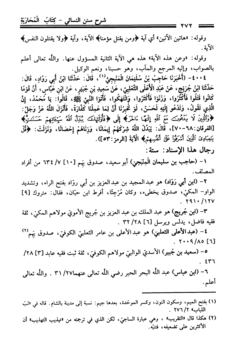 4004 - (أَخْبَرَنَا حَاجِبُ بْنُ سُلَيْمَانَ الْمَنْبِجِيُّ (¬1) , قَالَ: حَدَّثَنَا ابْنُ أَبِي رَوَّادٍ, قَالَ: حَدَّثَنَا ابْنُ جُرَيْجٍ, عَنْ عَبْدِ الأَعْلَى الثَّعْلَبِيِّ, عَنْ سَعِيدِ بْنِ جُبَيْرٍ, عَنِ ابْنِ عَبَّاسٍ, أَنَّ قَوْمًا كَانُوا قَتَلُوا فَأَكْثَرُوا, وَزَنَوْا فَأَكْثَرُوا, وَانْتَهَكُوا, فَأَتَوُا النَّبِيَّ - صلى اللَّه عليه وسلم -, قَالُوا يَا مُحَمَّدُ, إِنَّ الَّذِي تَقُولُ, وَتَدْعُو إِلَيْهِ لَحَسَنٌ, لَوْ تُخْبِرُنَا أَنَّ لِمَا عَمِلْنَا كَفَّارَةً, فَأَنْزَلَ اللَّهُ -عَزَّ وَجَلَّ-: {وَالَّذِينَ لاَ يَدْعُونَ مَعَ اللَّهِ إِلَهًا آخَرَ} إِلَى {فَأُولَئِكَ يُبَدِّلُ اللَّهُ سَيِّئَاتِهِمْ حَسَنَاتٍ} [الفرقان: 68 - 70] , قَالَ: يُبَدِّلُ اللَّهُ شِرْكَهُمْ إِيمَانًا, وَزِنَاهُمْ إِحْصَانًا, وَنَزَلَتْ {قُلْ يَاعِبَادِيَ الَّذِينَ أَسْرَفُوا عَلَى أَنْفُسِهِمْ} الآية [الزمر: 53] الآيَةَ).
