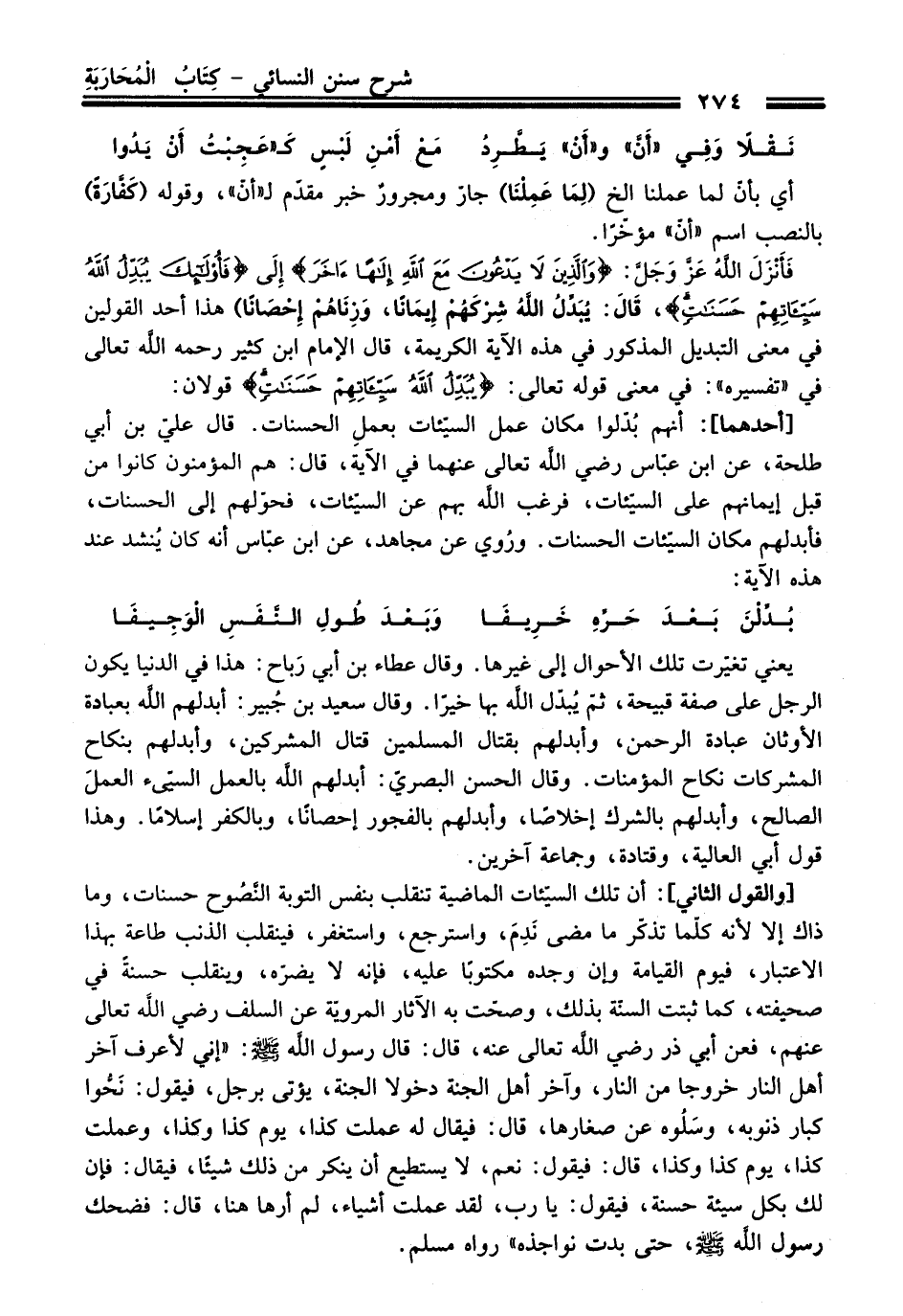 [والقول الثاني]: أن تلك السيّئات الماضية تنقلب بنفس التربة النَّصُوح حسنات، وما ذاك إلا لأنه كلّما تذكّر ما مضى نَدِمَ، واسترجع، واستغفر، فينقلب الذنب طاعة بهذا الاعتبار، فيوم القيامة وإن وجده مكتوبًا عليه، فإنه لا يضرّه، وينقلب حسنةً في صحيفته، كما ثبتت السنّة بذلك، وصحّت به الآثار المرويّة عن السلف - رضي اللَّه تعالى - عنهم، فعن أبي ذر - رضي اللَّه تعالى عنه -، قال: قال رسول اللَّه - صلى اللَّه عليه وسلم -: "إني لأعرف آخر أهل النار خروجا من النار، آخر أهل الجنة دخولا الجنة، يؤتى برجل، فيقول: نَحُّوا كبار ذنوبه، وسلُوه عن صغارها، قال: فيقال له عملت كذا، يوم كذا وكذا، وعملت كذا، يوم كذا وكذا، قال: فيقول: نعم، لا يستطيع أن ينكر من ذلك شيئًا، فيقال: فإن لك بكل سيئة حسنة، فيقول: يا رب، لقد عملت أشياء، لم أرها هنا، قال: فضحك رسول اللَّه - صلى اللَّه عليه وسلم -، حتى بدت نواجده" رواه مسلم.