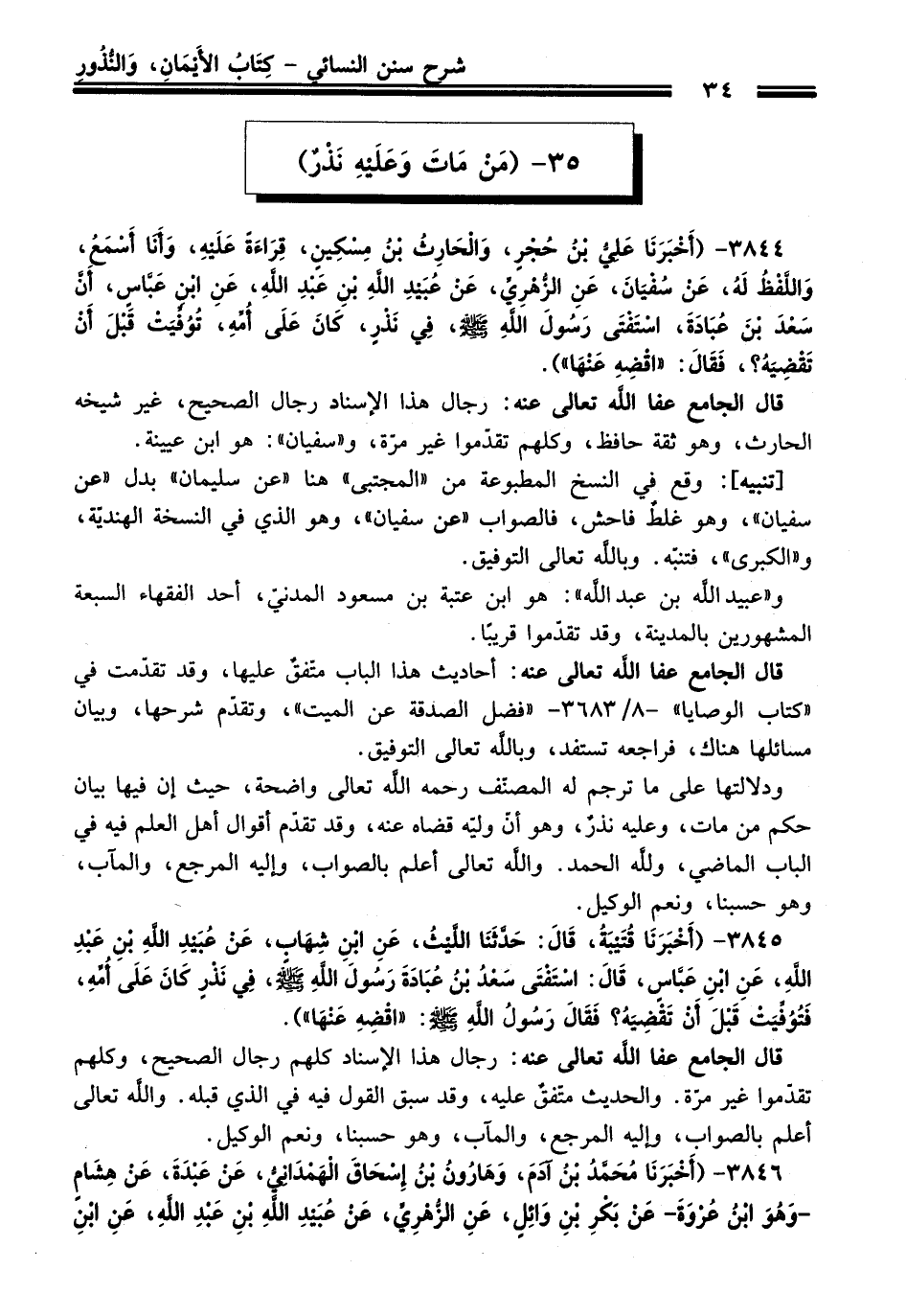 3845 - (أَخْبَرَنَا قُتَيْبَةُ، قَالَ: حَدَّثَنَا اللَّيْثُ، عَنْ ابْنِ شِهَابٍ، عَنْ عُبَيْدِ اللَّهِ بْنِ عَبْدِ اللَّهِ، عَنْ ابْنِ عَبَّاسٍ، قَالَ: اسْتَفْتَى سَعْدُ بْنُ عُبَادَةَ رَسُولَ اللَّهِ - صَلَّى اللَّهُ عَلَيْهِ وَسَلَّمَ -, فِي نَذْرٍ كَانَ عَلَى أُمِّهِ فَتُوُفِّيَتْ قَبْلَ أَنْ تَقْضِيَهُ؟ فَقَالَ: رَسُولُ اللَّهِ - صَلَّى اللَّهُ عَلَيْهِ وَسَلَّمَ -: "اقْضِهِ عَنْهَا").