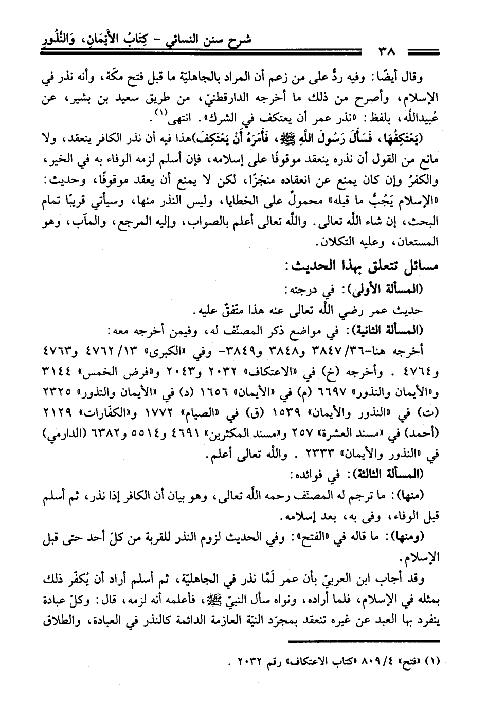 يَعْتَكِفُهَا، فَسَأَلَ رَسُولَ اللَّهِ - صَلَّى اللَّهُ عَلَيْهِ وَسَلَّمَ -، فَأَمَرَهُ أَنْ يَعْتَكِفَ) هذا فيه أن نذر الكافر ينعقد، ولا مانع من القول أن نذره ينعقد موقوفًا على إسلامه، فإن أسلم لزمه الوفاء به في الخير، والكفرُ وإن كان يمنع عن انعقاده منجّزًا، لكن لا يمنع أن يعقد موقوفًا، وحديث: "الإسلام يَجُبُّ ما قبله" محمول على الخطايا, وليس النذر منها، وسيأتي قريبًا تمام البحث، إن شاء اللَّه تعالى. واللَّه تعالى أعلم بالصواب، وإليه المرجع، والمآب، وهو المستعان، وعليه التكلان.