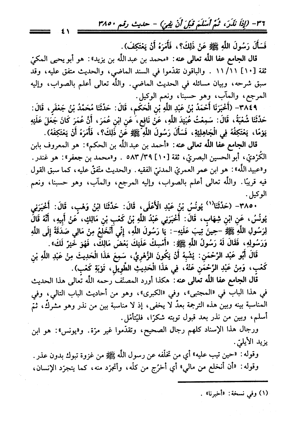 قَال الجامع - عفا اللَّه تعالى عنه -: هكذا أورد المصنّف -رحمه اللَّه تعالى- هذا الحديث في هذا الباب في "المجتبى"، وفي "الكبرى"، وهو من أحاديث الباب التالي، وفي المناسبة بينه وبين هذه الترجمة بعدٌ لا يخفى، إذ لا مناسبة بين من نذر وهو مشركٌ، ثمّ أسلم، وبين من نذر بعد قبول توبته شكرًا، فليُتأمّل.