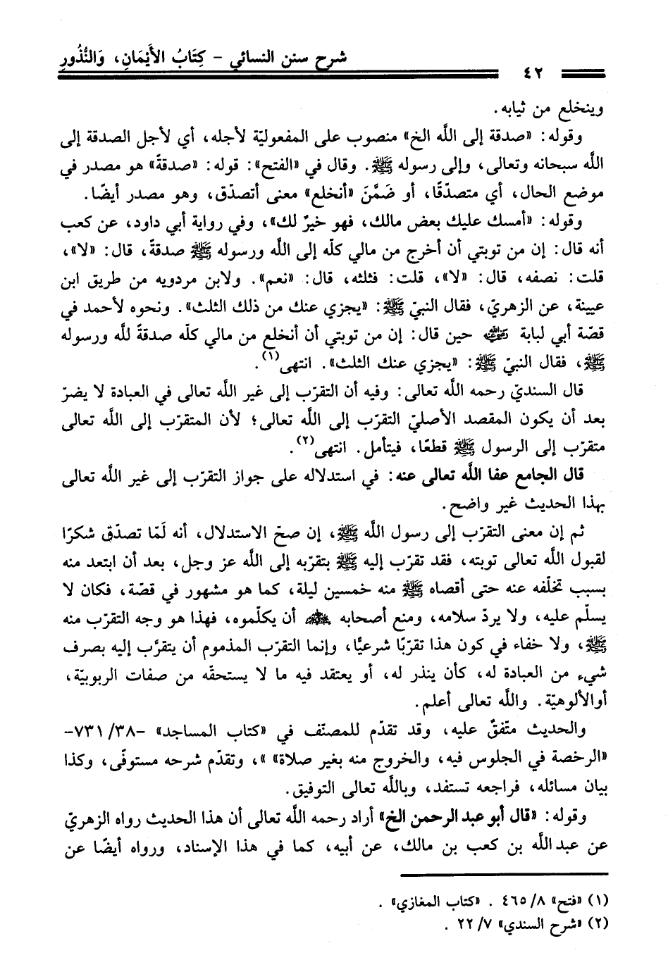 ثم إن معنى التقرّب إلى رسول اللَّه - صلى اللَّه عليه وسلم -، إن صحّ الاستدلال، أنه لَمّا تصدّق شكرًا لقبول اللَّه تعالى توبته، فقد تقرب إليه به. بتقرّبه إلى اللَّه -عَزَّ وَجَلَّ-، بعد أن ابتعد منه بسبب تخلّفه عنه حتى أقصاه - صلى اللَّه عليه وسلم - منه خمسين ليلة، كما هو مشهور في قصَّة، فكان لا يسلّم عليه، ولا يردّ سلامه، ومنع أصحابه - رضي اللَّه عنهم - أن يكلّموه، فهذا هو وجه التقرّب منه - صلى اللَّه عليه وسلم -، ولا خفاء في كون هذا تقرّبًا شرعيًّا، وإنما التقرّب المذموم أن يتقرَّب إليه بصرف شيء من العبادة له، كان ينذر له، أو يعتقد فيه ما لا يستحقّه من صفات الربوبيّة، أو الألوهيّة. واللَّه تعالى أعلم.