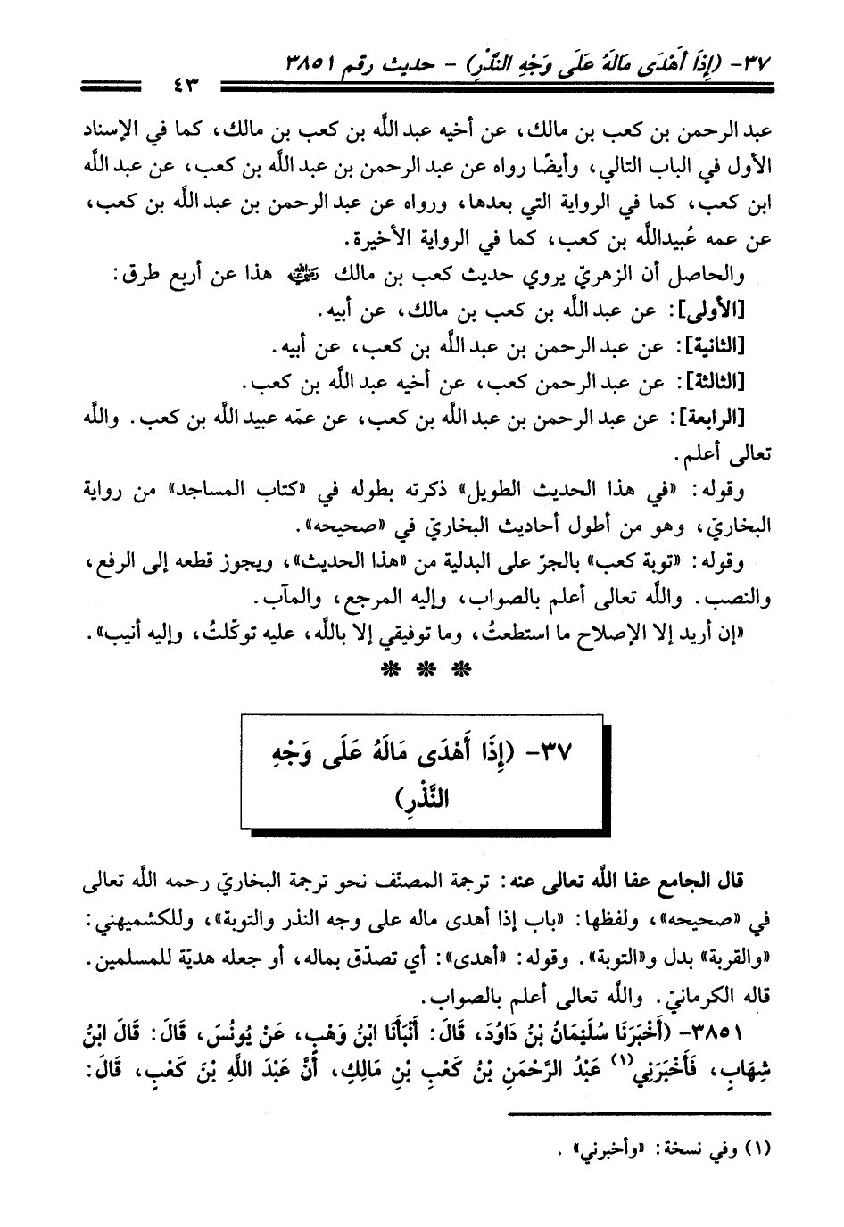 عبد الرحمن بن كعب بن مالك، عن أخيه عبد اللَّه بن كعب بن مالك، كما في الإسناد الأول في الباب التالي، وأيضًا رواه عن عبد الرحمن بن عبد اللَّه بن كعب، عن عبد اللَّه ابن كعب، كما في الرواية التي بعدها، ورواه عن عبد الرحمن بن عبد اللَّه بن كعب، عن عمه عُبيد اللَّه بن كعب، كما في الرواية الأخيرة.