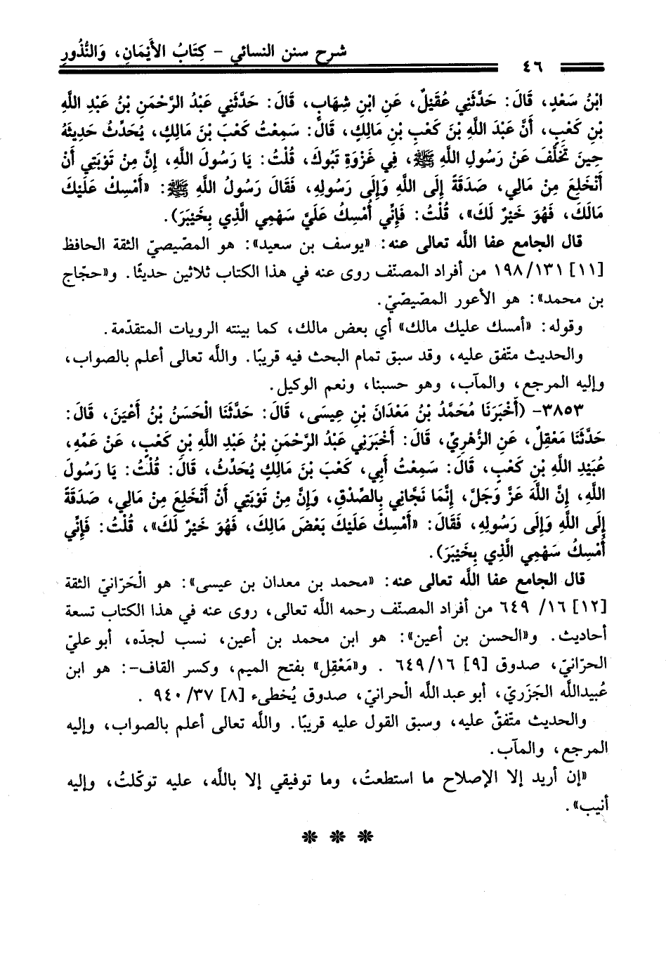 3853 - (أَخْبَرَنَا مُحَمَّدُ بْنُ مَعْدَانَ بْنِ عِيسَى، قَالَ: حَدَّثَنَا الْحَسَنُ بْنُ أَعْيَنَ، قَالَ: حَدَّثَنَا مَعْقِلٌ، عَنْ الزُّهْرِيِّ، قَالَ: أَخْبَرَنِي عَبْدُ الرَّحْمَنِ بْنُ عَبْدِ اللَّهِ بْنِ كَعْبٍ، عَنْ عَمِّهِ, عُبَيْدِ اللَّهِ بْنِ كَعْبٍ، قَالَ: سَمِعْتُ أَبِي, كَعْبَ بْنَ مَالِكٍ يُحَدِّثُ، قَالَ: قُلْتُ: يَا رَسُولَ اللَّهِ، إِنَّ اللَّهَ -عَزَّ وَجَلَّ-, إِنَّمَا نَجَّانِي بِالصِّدْقِ، وَإِنَّ مِنْ تَوْبَتِي أَنْ أَنْخَلِعَ مِنْ مَالِي, صَدَقَةً إِلَى اللَّهِ وَإِلَى رَسُولِهِ، فَقَالَ: "أَمْسِكْ عَلَيْكَ بَعْضَ مَالِكَ, فَهُوَ خَيْرٌ لَكَ"، قُلْتُ: فَإِنِّي أُمْسِكُ سَهْمِي الَّذِي بِخَيْبَرَ).