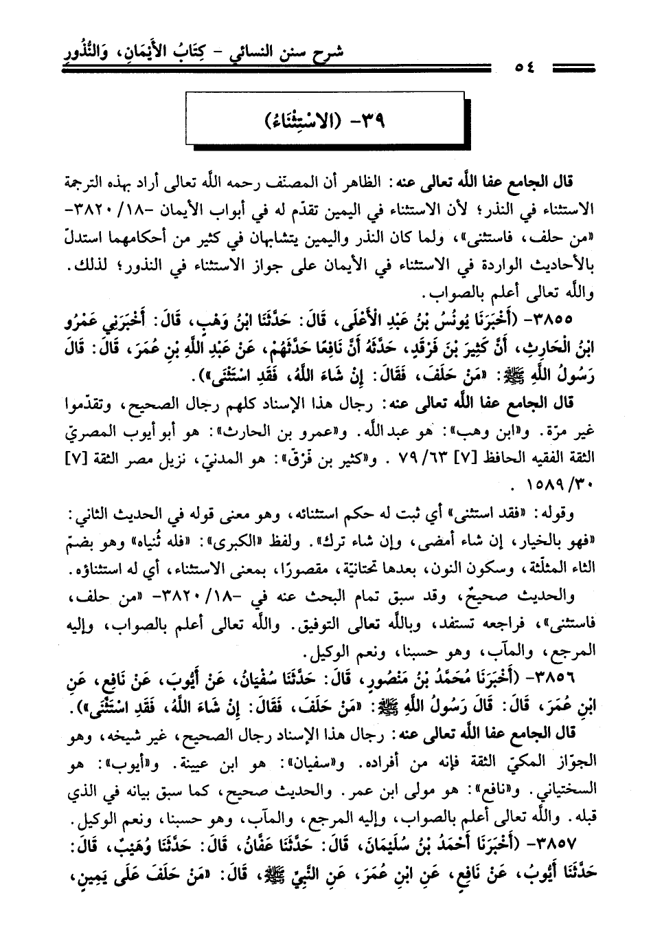3855 - (أَخْبَرَنَا يُونُسُ بْنُ عَبْدِ الأَعْلَى, قَالَ: حَدَّثَنَا ابْنُ وَهْبٍ, قَالَ: أَخْبَرَنِي عَمْرُو بْنُ الْحَارِثِ, أَنَّ كَثِيرَ بْنَ فَرْقَدٍ, حَدَّثَهُ أَنَّ نَافِعًا حَدَّثَهُمْ, عَنْ عَبْدِ اللَّهِ بْنِ عُمَرَ, قَالَ: قَالَ رَسُولُ اللَّهِ - صلى اللَّه عليه وسلم -: «مَنْ حَلَفَ, فَقَالَ: إِنْ شَاءَ اللَّهُ, فَقَدِ اسْتَثْنَى»).