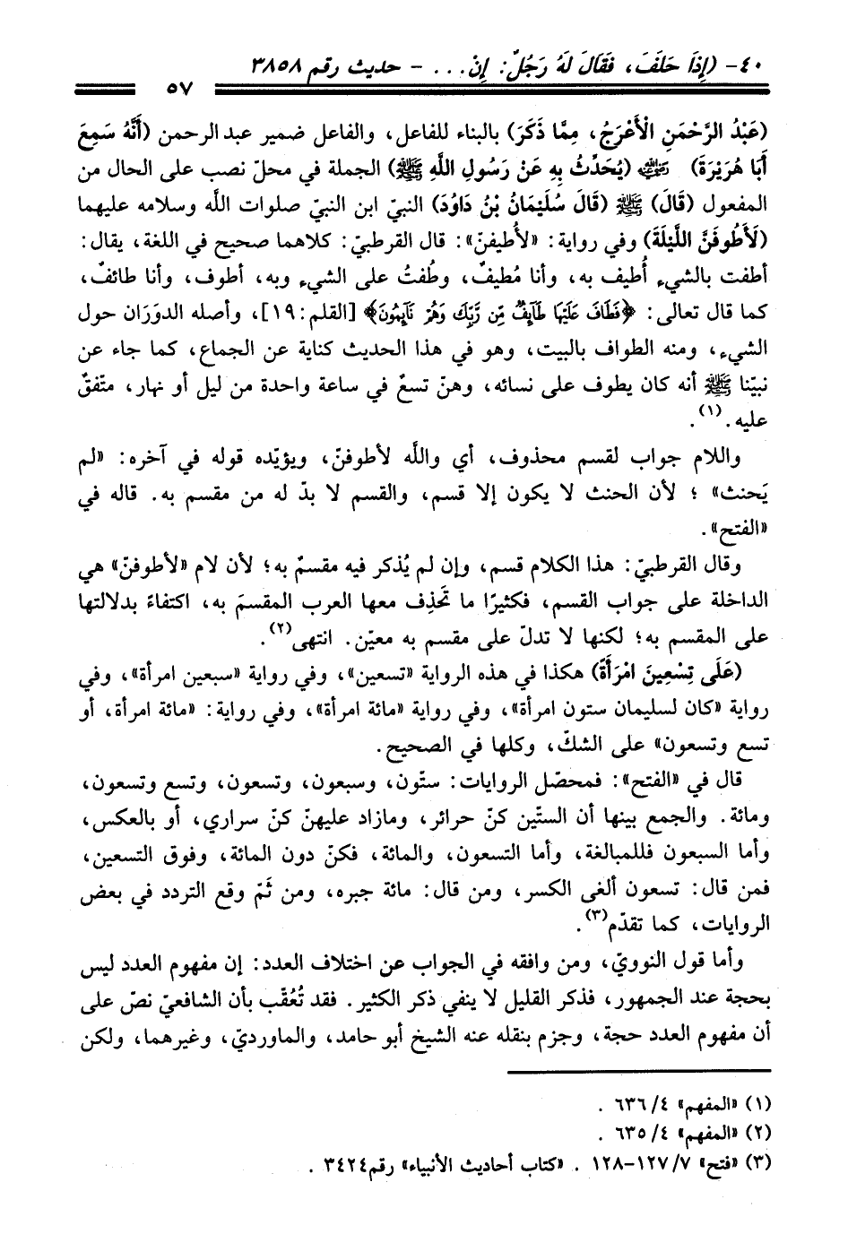 (عَبْدُ الرَّحْمَنِ الأَعْرَجُ، مِمَّا ذَكَرَ) بالبناء للفاعل، والفاعل ضمير عبد الرحمن (أَنَّهُ سَمِعَ أَبَا هُرَيْرَةَ) - رضي اللَّه عنه - (يُحَدِّثُ بِهِ , عَنْ رَسُولِ اللَّهِ - صلى اللَّه عليه وسلم -) الجملة في محلّ نصب على الحال من المفعول (قَالَ) - صلى اللَّه عليه وسلم - (قَالَ: سُلَيْمَانُ بْنُ دَاوُدَ) النبيّ ابن النبيّ صلوات اللَّه وسلامه عليهما (لَأَطُوفَنَّ اللَّيْلَةَ) وفي رواية: "لأُطيفنّ": قال القرطبيّ: كلاهما صحيح في اللغة، يقال: أطفت بالشيء أُطيف به، وأنا مُطيفٌ، وطُفتُ على الشيء وبه، أطوف، وأنا طائفٌ، كما قال تعالى: {فَطَافَ عَلَيْهَا طَائِفٌ مِنْ رَبِّكَ وَهُمْ نَائِمُونَ} [القلم: 19]، وأصله الدوَرَان حول الشيء، ومنه الطواف بالبيت، وهو في هذا الحديث كناية عن الجماع، كما جاء عن نبينا - صلى اللَّه عليه وسلم - أنه كان يطوف على نسائه، وهنّ تسعٌ في ساعة واحدة من ليل أو نهار، متّفقٌ عليه. (¬1).