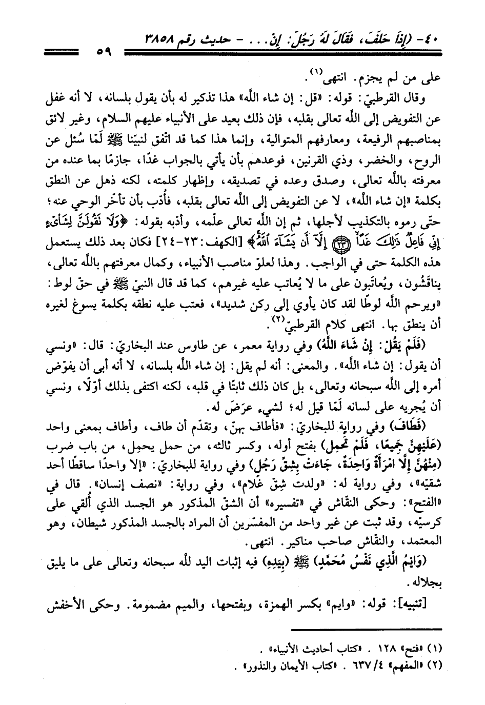 وقال القرطبيّ: قوله: "قل: إن شاء اللَّه" هذا تذكير له بأن يقول بلسانه، لا أنه غفل عن التفويض إلى اللَّه تعالى بقلبه، فإن ذلك بعيد على الأنبياء - عليهم السلام -، وغير لائق بمناصبهم الرفيعة، ومعارفهم المتوالية، وإنما هذا كما قد اتّفق لنبينا - صلى اللَّه عليه وسلم - لَمّا سُئل عن الروح، والخضر، وذي القرنين، فوعدهم بأن يأتي بالجواب غدًا، جازمًا بما عنده من معرفته باللَّه تعالى، وصدق وعده في تصديقه، وإظهار كلمته، لكنه ذهل عن النطق بكلمة "إن شاء اللَّه"، لا عن التفويض إلى اللَّه تعالى بقلبه، فأُدّب بأن تأخّر الوحي عنه؛ حتى رموه بالتكذيب لأجلها، ثم إن اللَّه تعالى علمه، وأدّبه بقوله: {وَلَا تَقُولَنَّ لِشَيْءٍ إِنِّي فَاعِلٌ ذَلِكَ غَدًا (23) إِلَّا أَنْ يَشَاءَ اللَّهُ} [الكهف: 23 - 24] فكان بعد ذلك يستعمل هذه الكلمة حتى في الواجب. وهذا لعلوّ مناصب الأنبياء، وكمال معرفتهم باللَّه تعالى، يناقَشُون، ويُعاتَبون على ما لا يُعاتب عليه غيرهم، كما قد قال النبيّ - صلى اللَّه عليه وسلم - في حقّ لوط: "ويرحم اللَّه لوطًا لقد كان يأوي إلى ركن شديد"، فعتب عليه نطقه بكلمة يسوغ لغيره أن ينطق بها. انتهى كلام القرطبيّ (¬2).