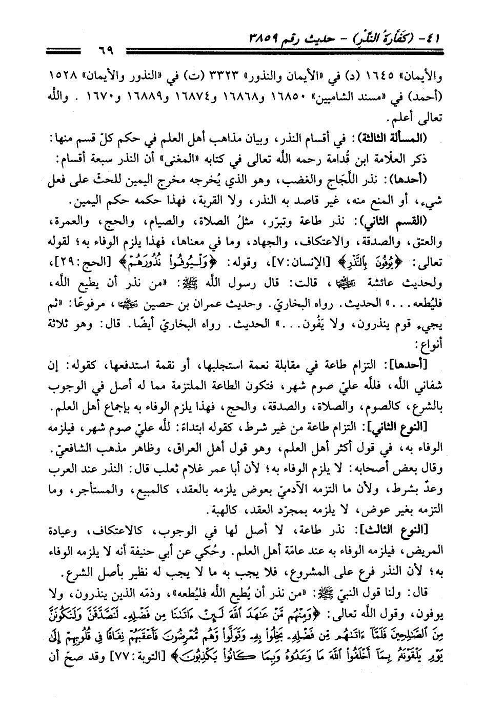 قال: ولنا قول النبيّ - صلى اللَّه عليه وسلم -: "من نذر أن يُطيع اللَّه فليُطعه"، وذمّه الذين ينذرون، ولا يوفون، وقول اللَّه تعالى: {وَمِنْهُمْ مَنْ عَاهَدَ اللَّهَ لَئِنْ آتَانَا مِنْ فَضْلِهِ لَنَصَّدَّقَنَّ وَلَنَكُونَنَّ مِنَ الصَّالِحِينَ (75) فَلَمَّا آتَاهُمْ مِنْ فَضْلِهِ بَخِلُوا بِهِ وَتَوَلَّوْا وَهُمْ مُعْرِضُونَ (76) فَأَعْقَبَهُمْ نِفَاقًا فِي قُلُوبِهِمْ إِلَى يَوْمِ يَلْقَوْنَهُ بِمَا أَخْلَفُوا اللَّهَ مَا وَعَدُوهُ وَبِمَا كَانُوا يَكْذِبُونَ} [التوبة: 75 - 77] وقد صحّ أن