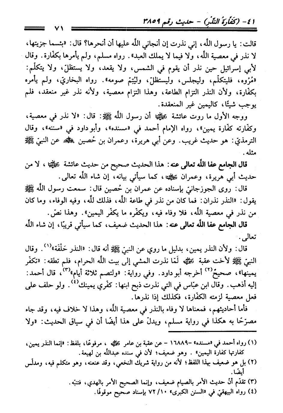 (¬1) رواه أحمد في "مسنده" -16889 - عن عقبة بن عامر - رضي اللَّه عنه -، مرفوعًا، بلفظ: "إنما النذر يمين، كفارتها كفارة اليمين". وهو ضعيف؛ لأن في سنده عبد اللَّه بن لهيعة.