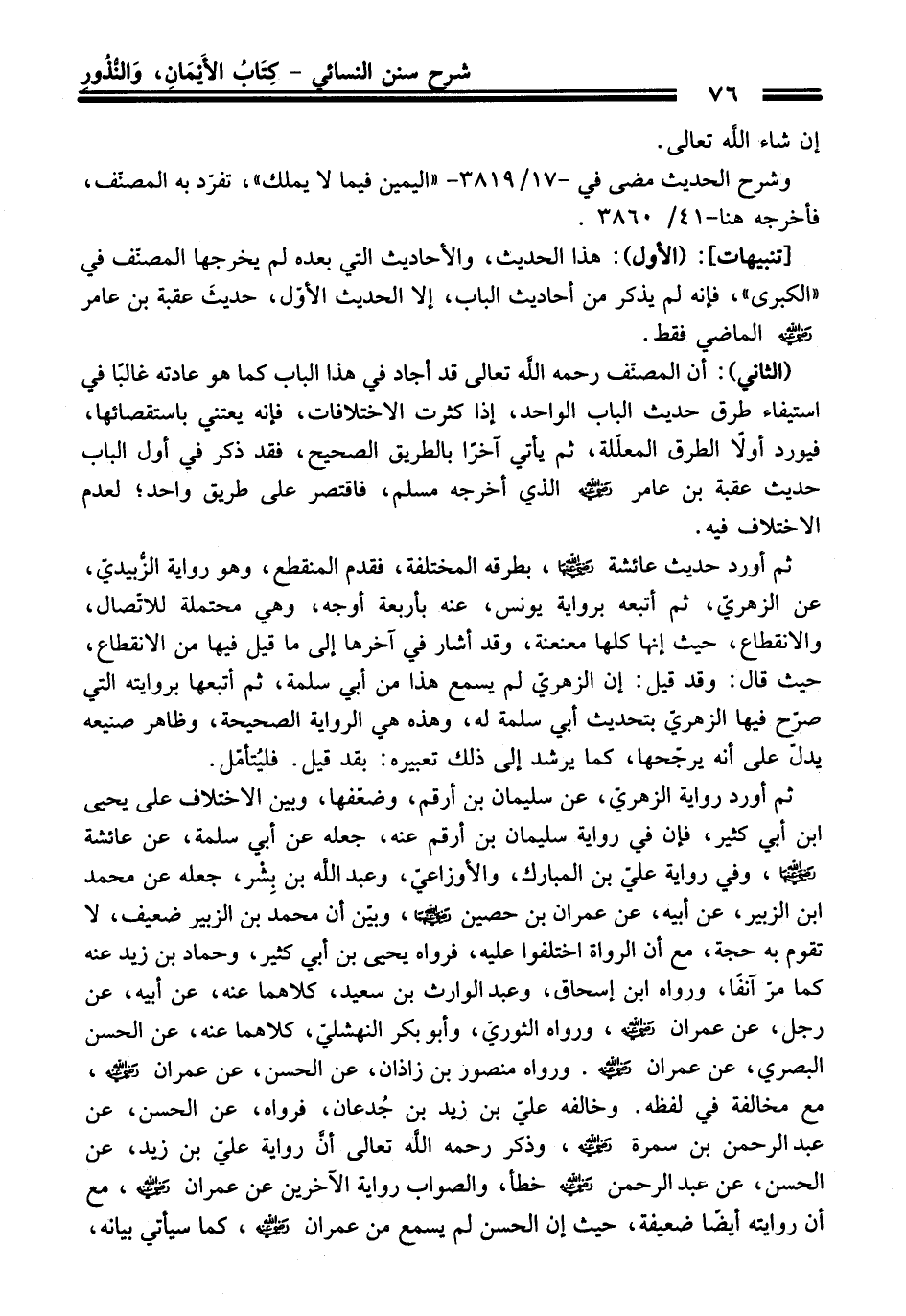 ثم أورد رواية الزهريّ، عن سليمان بن أرقم، وضعّفها، وبين الاختلاف على يحيى ابن أبي كثير، فإن في رواية سليمان بن أرقم عنه، جعله عن أبي سلمة، عن عائشة - رضي اللَّه عنها -، وفي رواية عليّ بن المبارك، والأوزاعيّ، وعبد اللَّه بن بِشْر، جعله عن محمد ابن الزبير، عن أبيه، عن عمران بن حصين - رضي اللَّه عنهما -، وبيّن أن محمد بن الزبير ضعيف، لا تقوم به حجة، مع أن الرواة اختلفوا عليه، فرواه يحيى بن أبي كثير، وحماد بن زيد عنه كما مرّ آنفًا، ورواه ابن إسحاق، وعبد الوارث بن سعيد، كلاهما عنه، عن أبيه، عن رجل، عن عمران - رضي اللَّه عنه -، ورواه الثوريّ، وأبو بكر النهشليّ، كلاهما عنه، عن الحسن البصريّ، عن عمران - رضي اللَّه عنه -. ورواه منصور بن زاذان، عن الحسن، عن عمران - رضي اللَّه عنه -، مع مخالفة في لفظه. وخالفه عليّ بن زيد بن جُدعان، فرواه، عن الحسن، عن عبد الرحمن بن سمرة - رضي اللَّه عنه -، وذكر -رحمه اللَّه تعالى- أن رواية عليّ بن زيد، عن الحسن، عن عبد الرحمن - رضي اللَّه عنه - خطأ، والصواب رواية الآخرين عن عمران - رضي اللَّه عنه -، مع أن روايته أيضًا ضعيفة، حيث إن الحسن لم يسمع من عمران ن - رضي اللَّه عنه -، كما سيأتي بيانه،