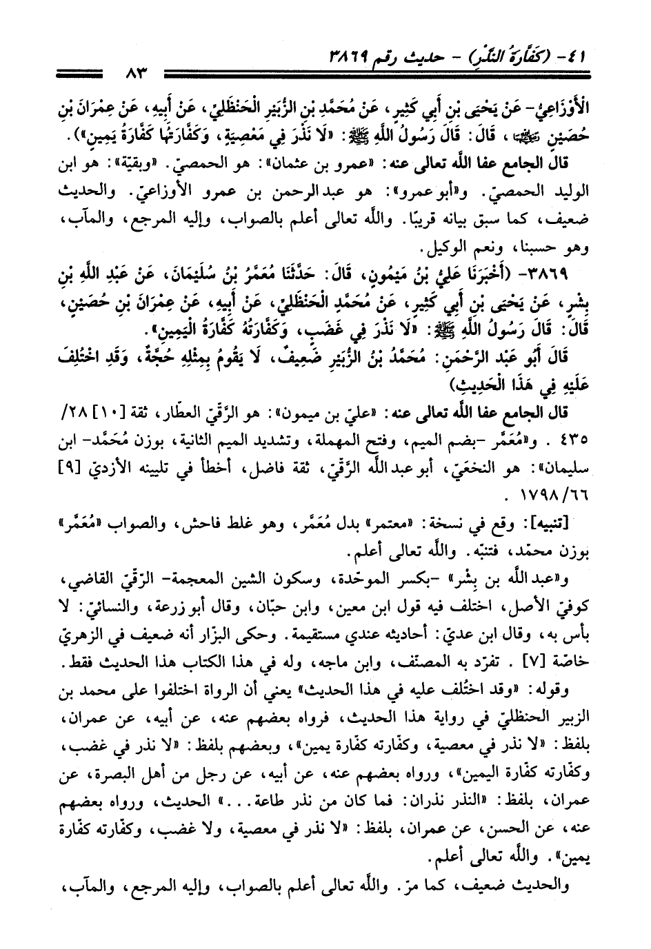 الأَوْزَاعِيُّ -عَنْ يَحْيَى بْنِ أَبِي كَثِيرٍ, عَنْ مُحَمَّدِ بْنِ الزُّبَيْرِ الْحَنْظَلِيِّ, عَنْ أَبِيهِ, عَنِ عِمْرَانَ بْنِ حُصَيْنٍ - رضي اللَّه عنهما -, قَالَ: قَالَ رَسُولُ اللَّهِ - صلى اللَّه عليه وسلم -: «لاَ نَذْرَ فِي مَعْصِيَةٍ, وَكَفَّارَتُهَا كَفَّارَةُ يَمِينٍ»).