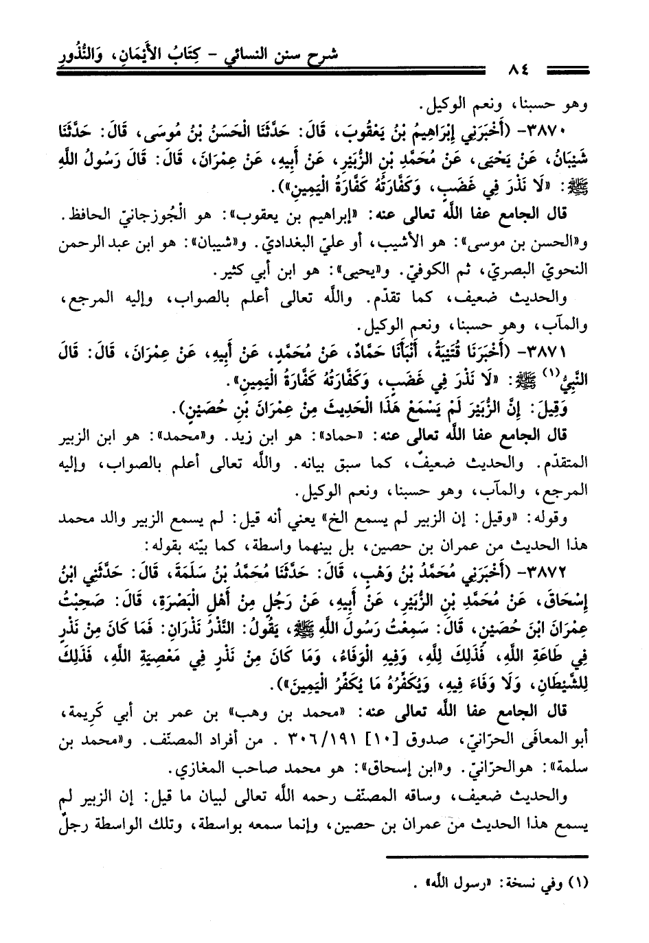 3870 - (أَخْبَرَنِي إِبْرَاهِيمُ بْنُ يَعْقُوبَ, قَالَ: حَدَّثَنَا الْحَسَنُ بْنُ مُوسَى, قَالَ: حَدَّثَنَا شَيْبَانُ, عَنْ يَحْيَى, عَنْ مُحَمَّدِ بْنِ الزُّبَيْرِ, عَنْ أَبِيهِ, عَنْ عِمْرَانَ, قَالَ: قَالَ رَسُولُ اللَّهِ - صلى اللَّه عليه وسلم -: «لاَ نَذْرَ فِي غَضَبٍ, وَكَفَّارَتُهُ كَفَّارَةُ الْيَمِينِ»).