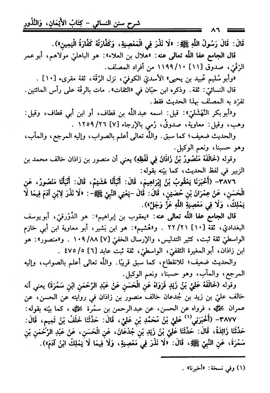3876 - (أَخْبَرَنَا يَعْقُوبُ بْنُ إِبْرَاهِيمَ, قَالَ: أَنْبَأَنَا هُشَيْمٌ, قَالَ: أَنْبَأَنَا مَنْصُورٌ, عَنِ الْحَسَنِ, عَنْ عِمْرَانَ بْنِ حُصَيْنٍ, قَالَ: قَالَ -يَعْنِي النَّبِيَّ - صلى اللَّه عليه وسلم - «لاَ نَذْرَ لاِبْنِ آدَمَ فِيمَا لاَ يَمْلِكُ, وَلاَ فِي مَعْصِيَةِ اللَّهِ -عَزَّ وَجَلَّ-».