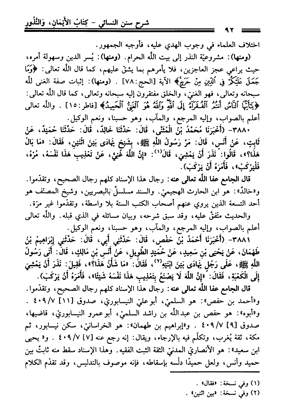 3881 - (أَخْبَرَنَا أَحْمَدُ بْنُ حَفْصٍ قَالَ: حَدَّثَنِي أَبِي, قَالَ: حَدَّثَنِي إِبْرَاهِيمُ بْنُ طَهْمَانَ, عَنْ يَحْيَى بْنِ سَعِيدٍ, عَنْ حُمَيْدٍ الطَّوِيلِ, عَنْ أَنَسِ بْنِ مَالِكٍ, قَالَ: أَتَى رَسُولُ اللَّهِ - صلى اللَّه عليه وسلم -, عَلَى رَجُلٍ يُهَادَى بَيْنَ ابْنَيْهِ (¬2) , فَقَالَ: «مَا شَأْنُ هَذَا؟» , فَقِيلَ نَذَرَ أَنْ يَمْشِيَ إِلَى الْكَعْبَةِ, فَقَالَ: «إِنَّ اللَّهَ لاَ يَصْنَعُ بِتَعْذِيبِ هَذَا نَفْسَهُ شَيْئًا» , فَأَمَرَهُ أَنْ يَرْكَبَ).