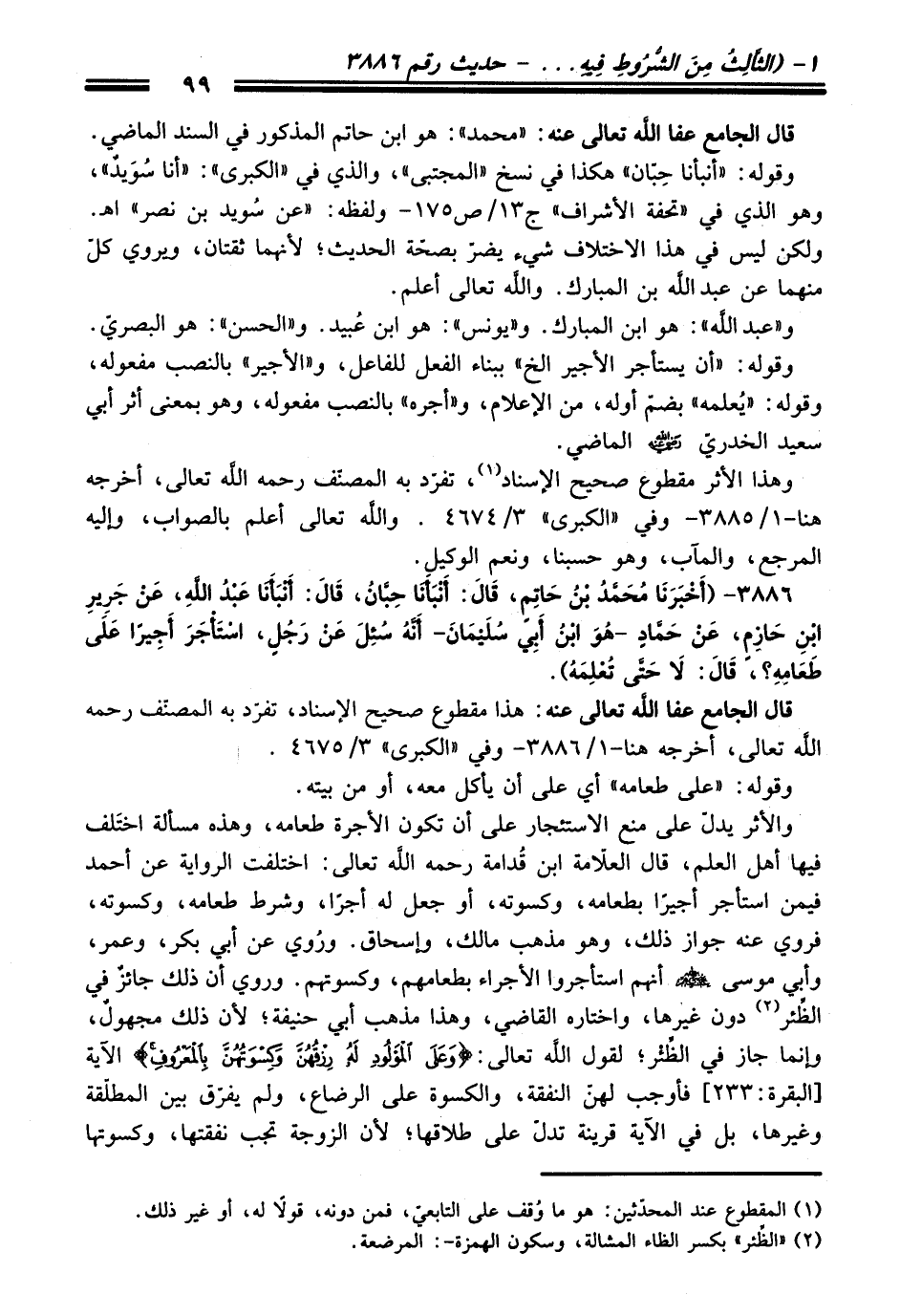 3886 - (أَخْبَرَنَا مُحَمَّدُ بْنُ حَاتِمٍ, قَالَ: أَنْبَأَنَا حِبَّانُ, قَالَ: أَنْبَأَنَا عَبْدُ اللَّهِ, عَنْ جَرِيرِ بْنِ حَازِمٍ, عَنْ حَمَّادٍ -هُوَ ابْنُ أَبِي سُلَيْمَانَ- أَنَّهُ سُئِلَ عَنْ رَجُلٍ, اسْتَأْجَرَ أَجِيرًا عَلَى طَعَامِهِ؟ , قَالَ: لاَ حَتَّى تُعْلِمَهُ).