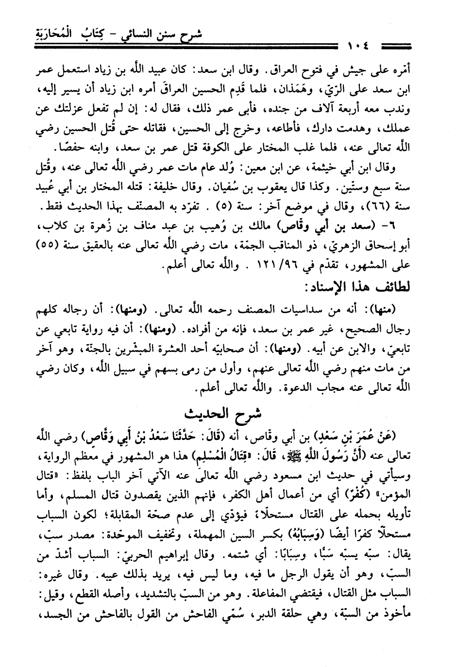 (منها): أنه من سداسيات المصنف -رحمه اللَّه تعالى-. (ومنها): أن رجاله كلهم رجال الصحيح، غير عمر بن سعد، فإنه من أفراده. (ومنها): أن فيه رواية تابعي عن تابعيّ، والابن عن أبيه. (ومنها): أن صحابيه أحد العشرة المبشرين بالجنّة، وهو آخر من مات منهم - رضي اللَّه تعالى عنهم -، وأول من رمى بسهم في سبيل اللَّه، وكان - رضي اللَّه تعالى عنه - مجاب الدعوة. واللَّه تعالى أعلم.