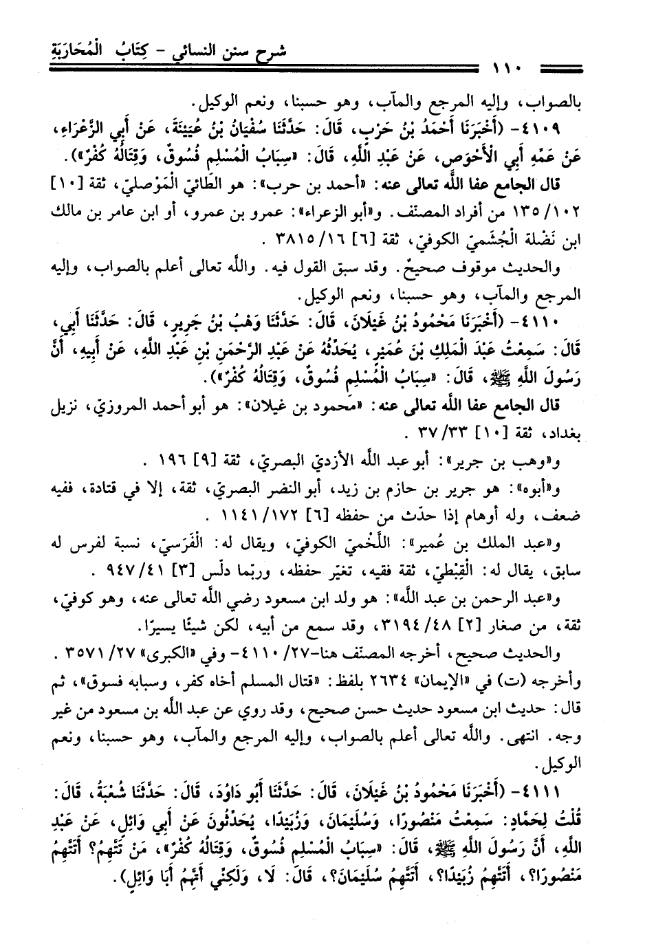 4110 - (أَخْبَرَنَا مَحْمُودُ بْنُ غَيْلاَنَ, قَالَ: حَدَّثَنَا وَهْبُ بْنُ جَرِيرٍ, قَالَ: حَدَّثَنَا أَبِي, قَالَ: سَمِعْتُ عَبْدَ الْمَلِكِ بْنَ عُمَيْرٍ, يُحَدِّثُهُ عَنْ عَبْدِ الرَّحْمَنِ بْنِ عَبْدِ اللَّهِ, عَنْ أَبِيهِ, أَنَّ رَسُولَ اللَّهِ - صلى اللَّه عليه وسلم -, قَالَ: «سِبَابُ الْمُسْلِمِ فُسُوقٌ, وَقِتَالُهُ كُفْرٌ»).