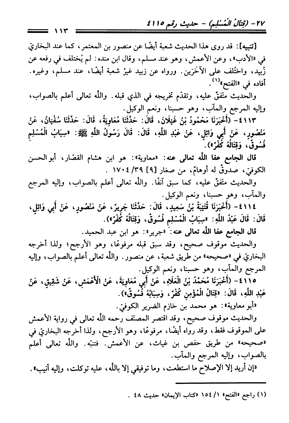 4114 - (أَخْبَرَنَا قُتَيْبَةُ بْنُ سَعِيدٍ, قَالَ: حَدَّثَنَا جَرِيرٌ, عَنْ مَنْصُورٍ, عَنْ أَبِي وَائِلٍ, قَالَ: قَالَ عَبْدُ اللَّهِ: "سِبَابُ الْمُسْلِمِ فُسُوقٌ, وَقِتَالُهُ كُفْرٌ").