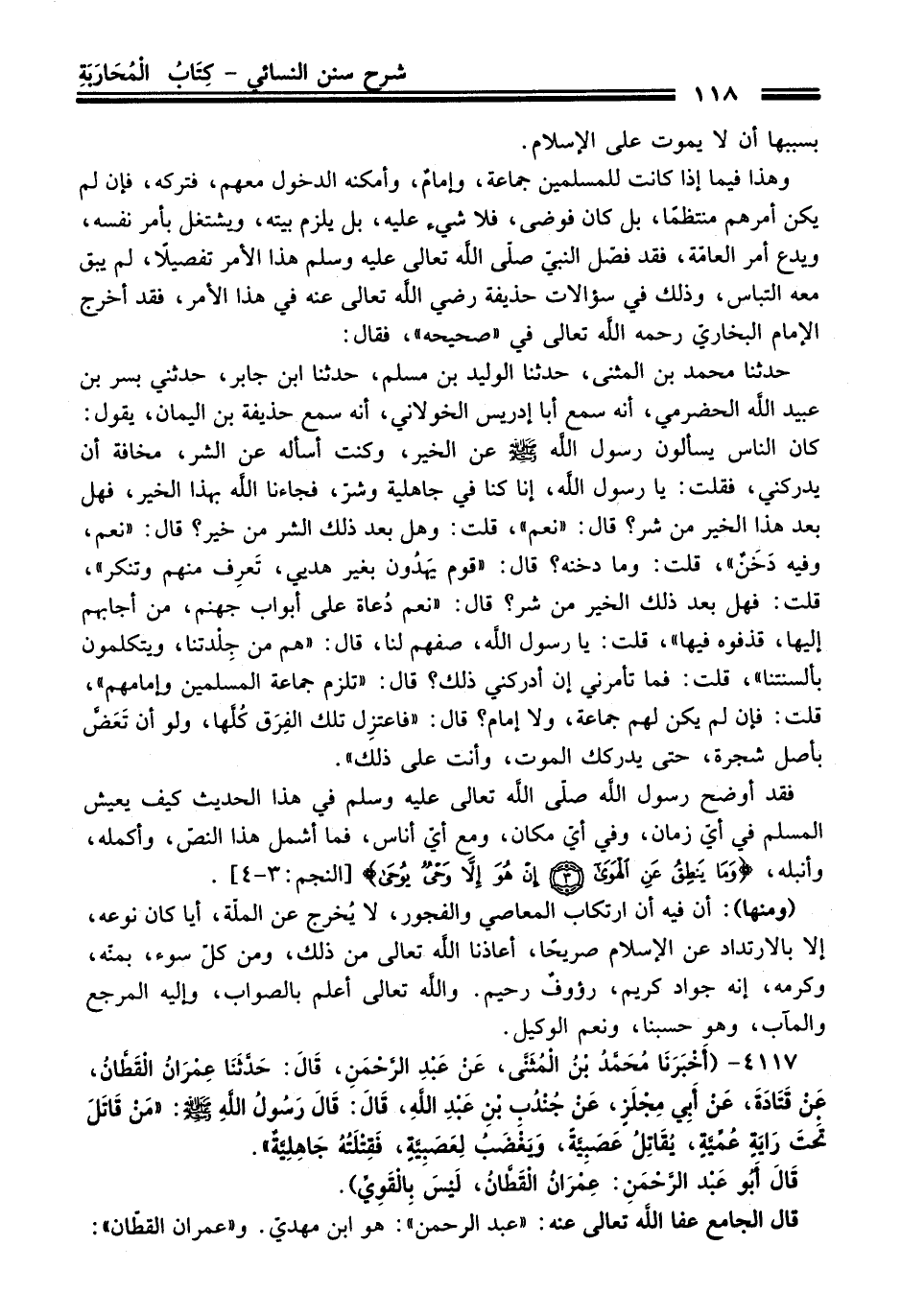 حدثنا محمد بن المثنى، حدثنا الوليد بن مسلم، حدثنا ابن جابر، حدثني بسر بن عبيد اللَّه الحضرمي، أنه سمع أبا إدريس الخولاني، أنه سمع حذيفة بن اليمان، يقول: كان الناس يسألون رسول اللَّه - صلى اللَّه عليه وسلم - عن الخير، وكنت أسأله عن الشر، مخافة أن يدركني، فقلت: يا رسول اللَّه - صلى اللَّه عليه وسلم -، إنا كنا في جاهلية وشرّ، فجاءنا اللَّه بهذا الخير، فهل بعد هذا الخير من شر؟ قال: "نعم"، قلت: وهل بعد ذلك الشر من خير؟ قال: "نعم، وفيه دَخَنٌ"، قلت: وما دخنه؟ قال: "قوم يَهدُون بغير هدي، تَعرِف منهم وتنكر"، قلت: فهل بعد ذلك الخير من شر؟ قال: "نعم دُعاة على أبواب جهنم، من أجابهم إليها، قذفوه فيها"، قلت: يا رسول اللَّه، صفهم لنا، قال: "هم من جِلْدتنا، ويتكلمون بألسنتنا"، قلت: فما تأمرني إن أدركني ذلك؟ قال: "تلزم جماعة المسلمين وإمامهم"، قلت: فإن لم يكن لهم جماعة، ولا إمام؟ قال: "فاعتزِل تلك الفِرق كُلَّها، ولو أن تَعَضَّ بأصل شجرة، حتى يدركك الموت، وأنت على ذلك".