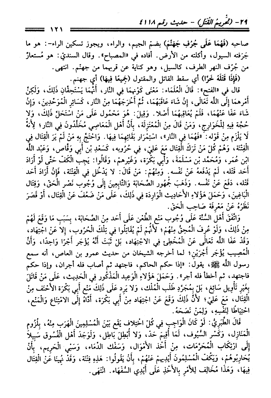 قال في "الفتح": قال العُلماء: مغنى كوْنهما في النار، أنهما يستحِقَّانِ ذَلِكَ، ولكِنَّ أمرهما إِلى اللَّه تعالى، إن شاء عاقبهُما، ثُمَّ أخرجهُما من النار، كسائِرِ الموحِّدِين، وإن شاء عفا عنهُما، فلم يُعاقِبهُما أصلا. وقِيل: هُو محمُول على من استحلّ ذَلِكَ، ولا حُجة فِيهِ لِلخوارِج، ومنْ قال من المعتزِلة، بِان أهل المعاصِي مُخلَّدُون في النار؛ لِأنَّه لا يلزم من قوْله: "فهُما في النار"، استِمرار بقائِهِما فِيها. واحتجّ بِهِ من لم ير القِتال في الفِتنة، وهُنم كُل من ترك القِتال مع عليّ، في حُرُوبه، كسعدِ بْن أبِي وقاص، وعبد اللَّه ابن عُمر، ومُحمد بْن مسلمة، وأبِي بكرة، وغيرهم، وقالُوا: يجِب الكف حتى لوْ أراد أحد قتله، لم يدْفعهُ عن نفسه: ومِتهُم: من قال: لا يدْخُل في الفِتنة، فإن أراد أحد قتله، دفع عن نفسه. وذهب جمُهُور الصحابة والتابِعِين إِلى وُجُوب نصر الحقّ، وقتال الباغِين، وحمل هؤُلاءِ الأحادِيث الوارِدة في ذَلِكَ، على من ضعُف عن القِتال، أوْ قصر نظرُهُ عن معرِفة صاحِب الحقّ.