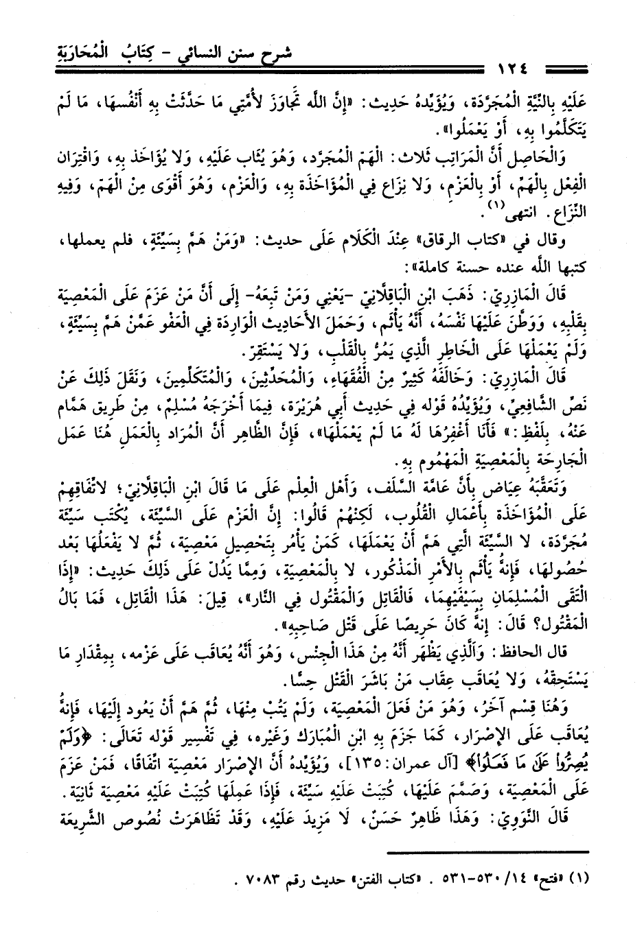 وتعقَّبهُ عِياض بِأن عامّة السلف، وأهل العِلم على ما قال ابْنِ الباقِلَّانِي؛ لاتفاقِهِم على المؤاخذة بِأعمالِ القُلُوِب، لكِنهُم قالُوا: إِنَّ العزم على السَّيّئة، يُكتب سيِّئة مُجرَّدة، لا السَّيِّئة التِي هم أن يعملها، كمن يأمر بِتحصِيلِ معصِية، ثُمَّ لا يفعلُها بعد حُصُولها، فإنَّه يأثم بِالأمرِ المذكور، لا بِالمعصِيةِ، ومِمّا يدُل على ذَلِكَ حدِيث: "إِذا التقى المسلِمانِ بِسيفيهِما، فالقاتِل والمقتُول في النَّار"، قِيل: هذا القاتِل، فما بالُ المقتُول؟ قال: إِنَّهُ كان حرِيصًا على قتل صاحِبهِ".