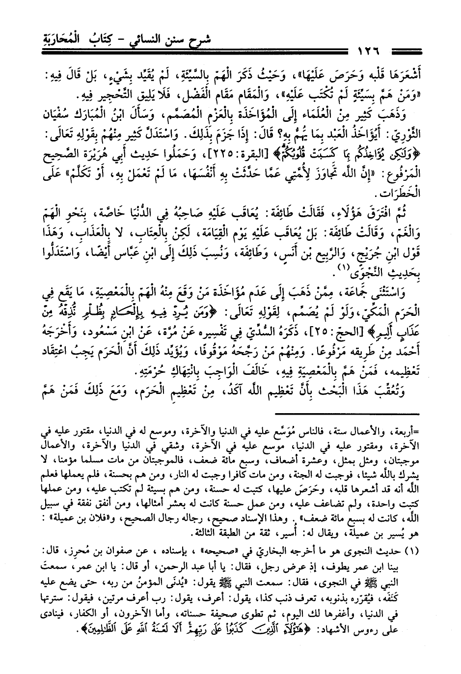 ثُمَّ افترق هؤُلاءِ، فقالت طائِفة: يُعاقب عليهِ صاحِبُهُ في الدّنيا خاصَّة، بِنحوِ الهمّ والغمّ، وقالت طائِفة: بل يُعاقب عليهِ يوْم القِيامة، لكِن بالعِتاب، لا بالعذاب، وهذا قول ابْنِ جُريج، والرَّبِيع بن أنسِ، وطائفة، ونُسِب ذَلِكَ إِلى ابْنِ عبّاس أيضًا، واستدلُّوا بِحدِيثِ النَّجوْى (¬1).