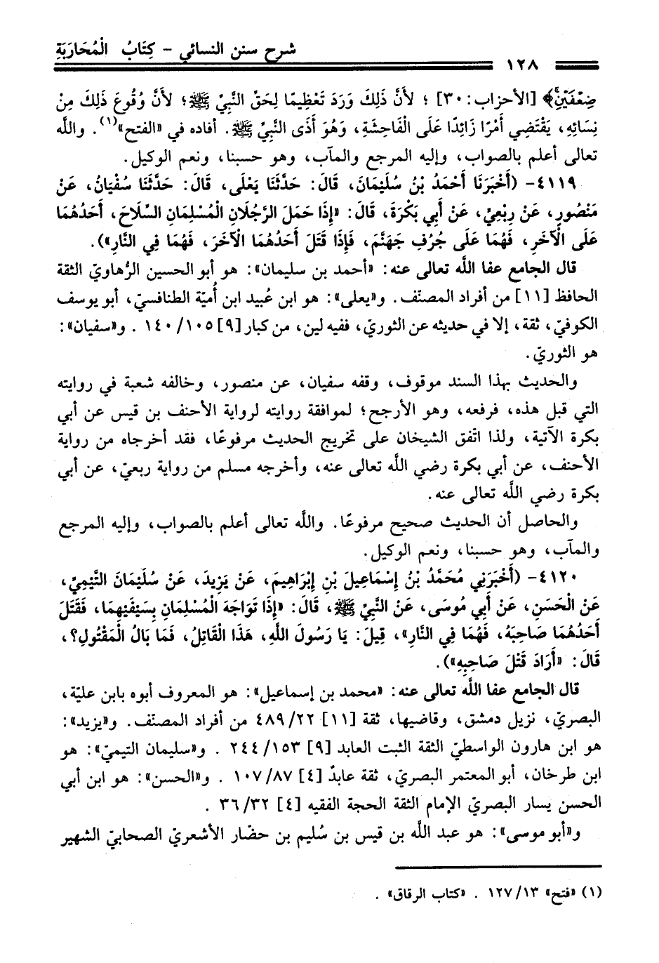 4119 - (أَخْبَرَنَا أَحْمَدُ بْنُ سُلَيْمَانَ, قَالَ: حَدَّثَنَا يَعْلَى, قَالَ: حَدَّثَنَا سُفْيَانُ, عَنْ مَنْصُورٍ, عَنْ رِبْعِيٍّ, عَنْ أَبِي بَكْرَةَ, قَالَ: "إِذَا حَمَلَ الرَّجُلاَنِ الْمُسْلِمَانِ السِّلاَحَ, أَحَدُهُمَا عَلَى الآخَرِ, فَهُمَا عَلَى جُرُفِ جَهَنَّمَ, فَإِذَا قَتَلَ أَحَدُهُمَا الآخَرَ, فَهُمَا فِي النَّارِ").