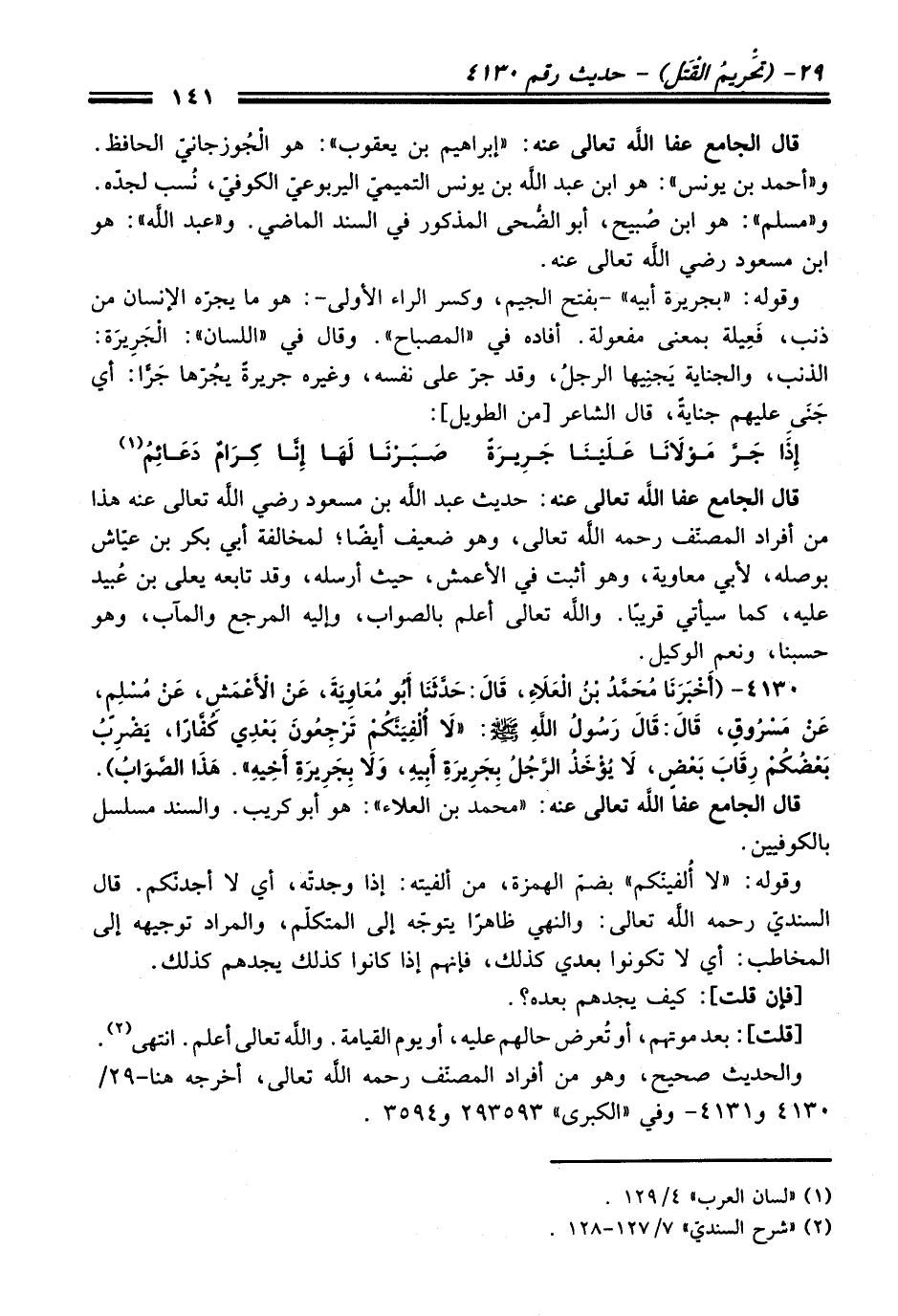 4130 - (أَخْبَرَنَا مُحَمَّدُ بْنُ الْعَلاَءِ, قَالَ: حَدَّثَنَا أَبُو مُعَاوِيَةَ, عَنِ الأَعْمَشِ, عَنْ مُسْلِمٍ, عَنْ مَسْرُوقٍ, قَالَ: قَالَ رَسُولُ اللَّهِ - صلى اللَّه عليه وسلم -: «لاَ أُلْفِيَنَّكُمْ تَرْجِعُونَ بَعْدِي كُفَّارًا, يَضْرِبُ بَعْضُكُمْ رِقَابَ بَعْضٍ, لاَ يُؤْخَذُ الرَّجُلُ بِجَرِيرَةِ أَبِيهِ, وَلاَ بِجَرِيرَةِ أَخِيهِ». هَذَا الصَّوَابُ).