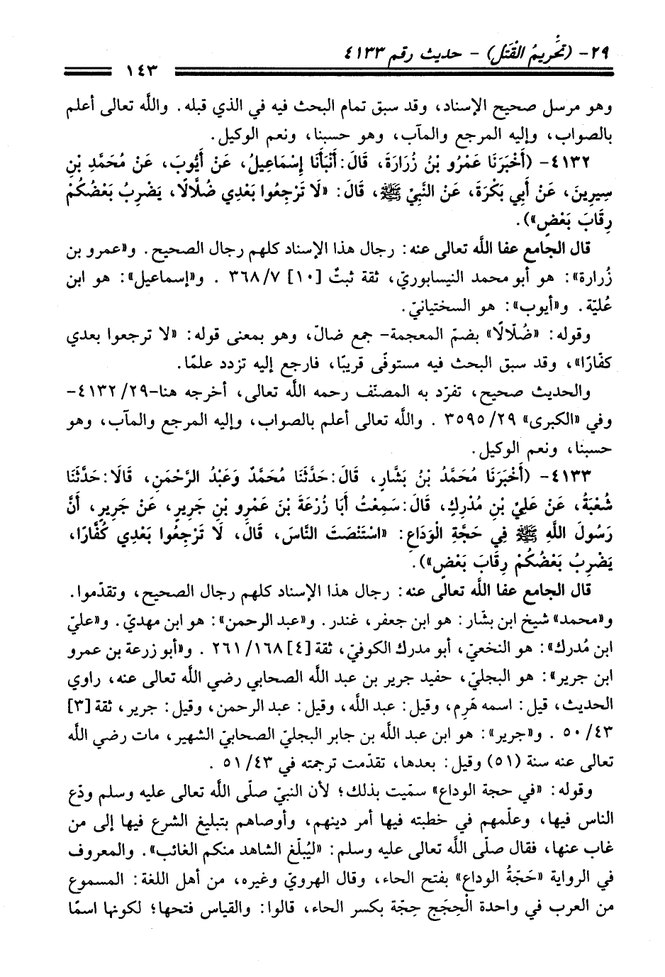 4133 - (أَخْبَرَنَا مُحَمَّدُ بْنُ بَشَّارٍ, قَالَ: حَدَّثَنَا مُحَمَّدٌ وَعَبْدُ الرَّحْمَنِ, قَالاَ: حَدَّثَنَا شُعْبَةُ, عَنْ عَلِيِّ بْنِ مُدْرِكٍ, قَالَ: سَمِعْتُ أَبَا زُرْعَةَ بْنَ عَمْرِو بْنِ جَرِيرٍ, عَنْ جَرِيرٍ, أَنَّ رَسُولَ اللَّهِ - صلى اللَّه عليه وسلم - فِي حَجَّةِ الْوَدَاعِ: اسْتَنْصَتَ النَّاسَ, قَالَ: «لاَ تَرْجِعُوا بَعْدِي كُفَّارًا, يَضْرِبُ بَعْضُكُمْ رِقَابَ بَعْضٍ»).