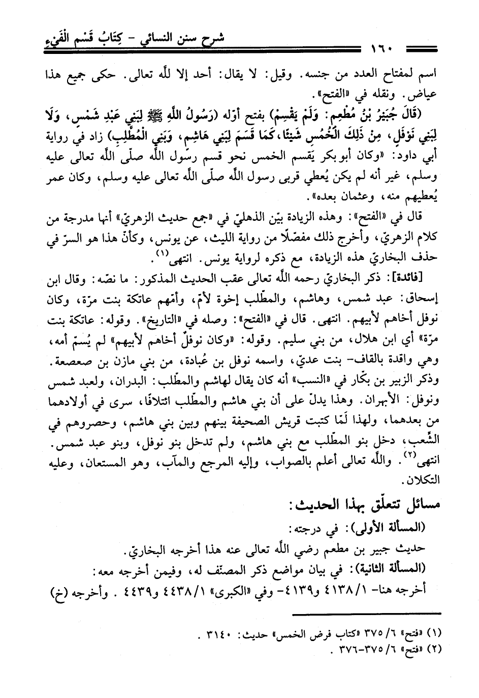 [فائدة]: ذكر البخاريّ -رحمه اللَّه تعالى- عقب الحديث المذكور: ما نصّه: وقال ابن إسحاق: عبد شمس، وهاشم، والمطّلب إخوة لأمّ، وأمّهم عاتكة بنت مرّة، وكان نوفل أخاهم لأبيهم. انتهى. قال في "الفتح": وصله في "التاريخ". وقوله: عاتكة بنت مرّة" أي ابن هلال، من بني سليم. وقوله: "وكان نوفلٌ أخاهم لأبيهم" لم يُسمّ أمه، وهي واقدة بالقاف- بنت عديّ، واسمه نوفل بن عُبادة، من بني مازن بن صعصعة. وذكر الزبير بن بكّار في "النسب" أنه كان يقال لهاشم والمطّلب: البدران، ولعبد شمس ونوفل: الأبهران. وهذا يدلّ على أن بني هاشم والمطّلب ائتلافًا، سرى في أولادهما من بعدهمالأولهذا لَمّا كتبت قريش الصحيفة بينهم وبين بني هاشم، وحصروهم في الشّعب، دخل بنو المطّلب مع بني هاشم، ولم تدخل بنو نوفل، وبنو عبد شمس. انتهى (¬2). واللَّه تعالى أعلم بالصواب، وإليه المرجع والمآب، وهو المستعان، وعليه التكلان.