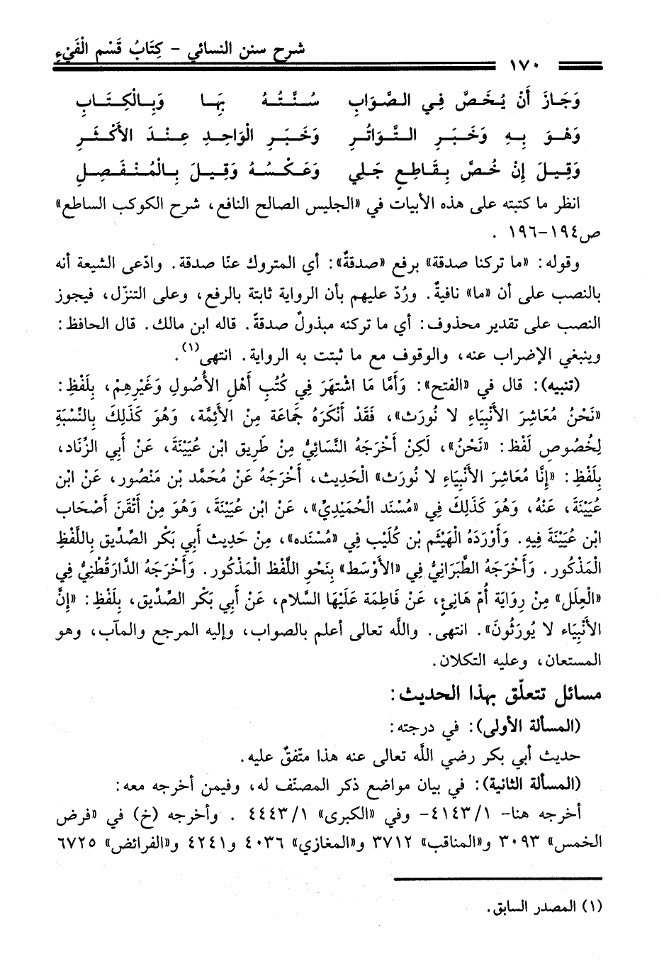 [تنبيه]: قال في "الفتح": وأمَّا ما اشتهر في كُتُبِ أهلِ الأُصُولِ وغيرِهِم، بِلفظِ: "نحنُ مُعاشِر الأنبِياءِ لا نُورث"، فقد أنكرهُ جمًاعة من الأئِمَّة، وهُو كذلِك بِالنَّسْبةِ لِخُصُوصِ لفظ: "نحنُ"، لكِق أخرجهُ النَّسائيُّ من طرِيق ابن عُيينة، عن أبِي الزَّناد، بِلفظِ: "إِنا مُعاشِر الأنبِياءِ لا نُورث" الحدِيث، أخرجهُ عن مُحمّد بن منصُور، عن ابن عُيينة، عنهُ، وهُو كذلِك في "مُسْنَد الحُميدِيَّ"، عن ابن عُيينة، وهو من أتقن أصْحاب ابن عُيينة فِيهِ. وأوردهُ الهيثم بن كُليب في "مُسنده"، مِن حدِيث أبِي بكر الصَّدَّيق بِاللَّفْظِ المذكُور. وأخرجهُ الطبرانِيُّ في "الأوْسط" بِنحوِ اللقظ المذكور. وأخرجهُ الدَّارقُطنِيُّ في "العِلل" مِن رِواية أُمّ هانِىءٍ، عن فاطِمة عليها السَّلام، عن أبِي بكر الصَّدَّيق، بلفظِ: "إِنَّ الأنبِياء لا يُورثُون". انتهى. واللَّه تعالى أعلم بالصواب، وإليه المرجع والمآب، وهو المستعان، وعليه التكلان.