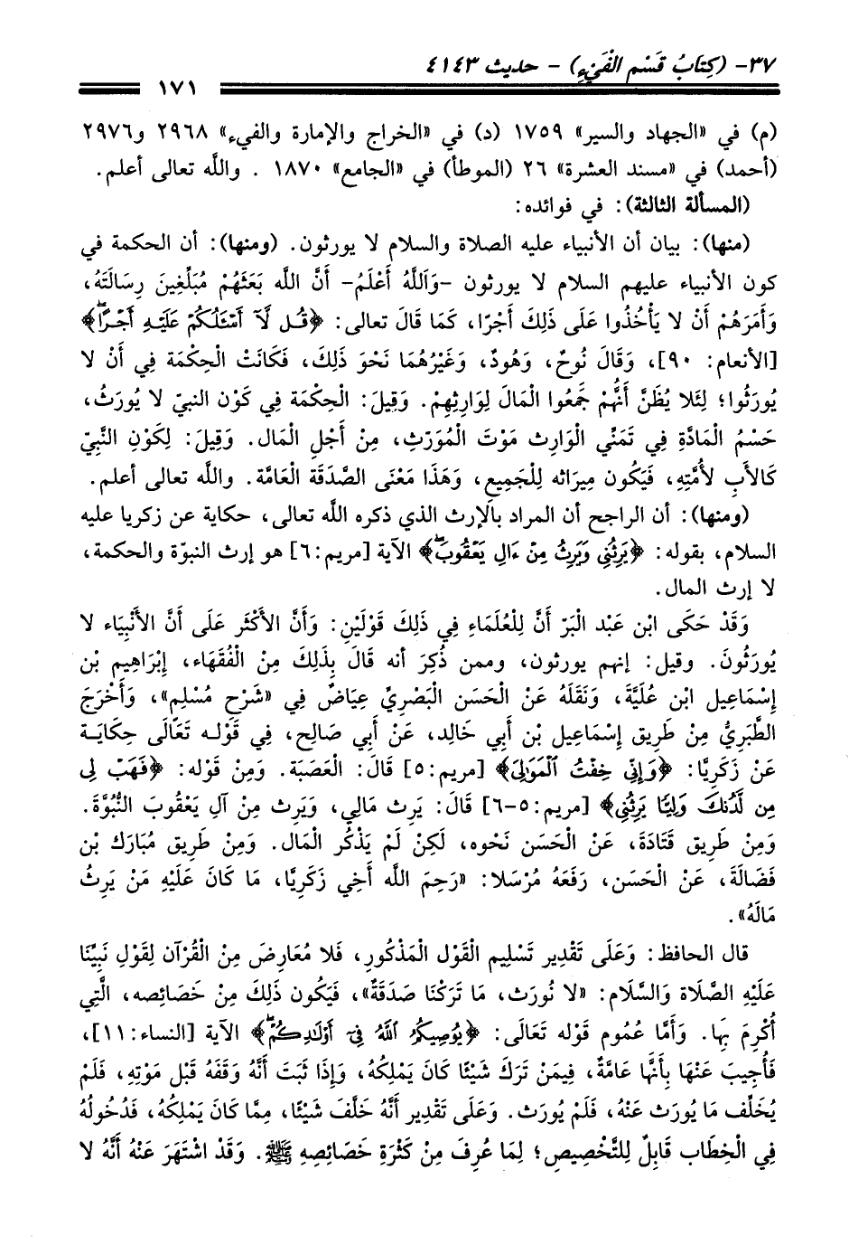 وقد حكى ابن عبد البّر أن لِلعُلماءِ في ذَلِكَ قوْلينِ: وأن الأكثر على أن الأنبِياء لا يُورثُون. وقيل: إنهم يورثون، وممن ذُكِر أنه قال بذلِك مِن الفُقهاء، إِبراهِيم بن إِسماعِيل ابن عُلية، ونقلهُ عن اِلحسن البصرِي عِياضٌ في "شرحِ مُسلِم"، وأخرج الطبرِيُّ من طرِيق إِسماعِيل بْن ابِي خالِد، عن أبِي صالِح، في قوله تعًالى حِكاية عن زكرِيّا: {وَإِنِّي خِفْتُ الْمَوَالِيَ} [مريم: 5]، قال: انعصبة. ومِن قوله: {فَهَبْ لِي مِنْ لَدُنْكَ وَلِيًّا (5) يَرِثُنِي} [مريم: 5، 6] قال: يرِث مالي، ويرِث مِن آلِ يعقُوب النبُوْة. ومِق طرِيق قتادة، عن الحسنُ نخوه، لكِن لم يذكُر المال. ومِن طرِيق مُبارك بن فضالة، عن الحسنُ، رفعهُ مُرْسلا: "رحِم اللَّه اخِي زكرِيّا، ما كان عليهِ من يرِثُ مالهُ".