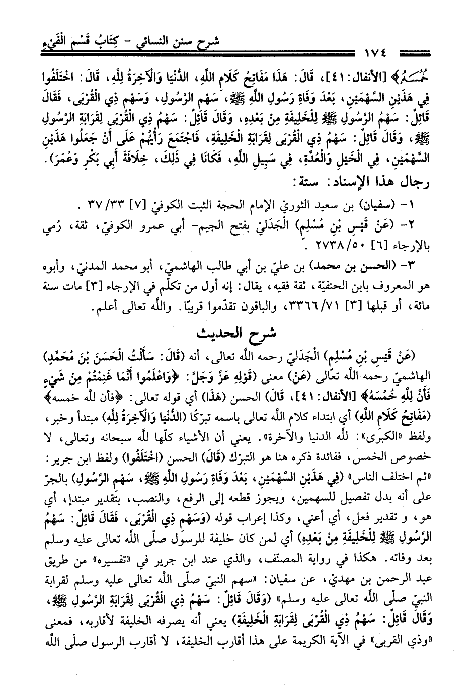 (عَنْ قَيْسِ بْنِ مُسْلِمٍ) الْجَدَلِيّ -رحمه اللَّه تعالى-، أنه (قَالَ: سَأَلْتُ الْحَسَنَ بْنَ مُحَمَّدٍ) الهاشمي -رحمه اللَّه تعالى- (عَنْ) معنى (قَولِهِ -عَزَّ وَجَلَّ-: {وَاعْلَمُوا أَنَّمَا غَنِمْتُمْ مِنْ شَيْءٍ فَأَنَّ لِلَّهِ خُمُسَهُ} [الأنفال: 41]، قَالَ) الحسن (هَذَا) أي قوله تعالى: {فإن للَّه خمسه} (مَفَاتِحُ كَلَام اللَّهِ) أي ابتداء كلام اللَّه تعالى باسمه تبرّكا (الدُّنْيَا وَالآخِرَةُ لِلَّهِ) مبتدأ وخبر، ولفظ "الكبرى": للَّه الدنيا والآخرة ". يعني أن الأشياء كلّها للَّه سبحانه وتعالى، لا خصوص الخمس، ففائدة ذكره هنا هو التبرّك (قَالَ) الحسن (اخْتَلَفُوا) ولفظ ابن جرير: "ثم اختلف الناس" (فِي هَذَيْنِ السَّهْمَيْنِ، بَعْدَ وَفَاةِ رَسُولِ اللَّهِ - صلى اللَّه عليه وسلم -، سَهْمِ الرَّسُولِ) بالجرّ على أنه بدل تفصيل للسهمين، ويجوز قطعه إلى الرفع، والنصب، بتَقدير مبتدإ، أي هو، وتقدير فعل، أي أعني، وكذا إعراب قوله (وَسَهْمِ ذِي القُرْبَى، فَقَالَ قَائِلٌ: سَهْمُ الرَّسُولِ - صلى اللَّه عليه وسلم - لِلْخَلِيفَةِ مِنْ بَعْدِهِ) أي لمن كان خليفة للرسول - صلى اللَّه تعالى عليه وسلم - بعد وفاته. هكذا في رواية المصنّف، والذي عند ابن جرير في "تفسيره" من طريق عبد الرحمن بن مهديّ، عن سفيان: "سهم النبيّ - صلى اللَّه تعالى عليه وسلم - لقرابة النبيّ - صلى اللَّه تعالى عليه وسلم -" (وَقَالَ قَائِلٌ: سَهْمُ ذِي القُرْبى لِقَرَابَةِ الرَّسُولِ - صلى اللَّه عليه وسلم -، وَقَالَ قَائِلٌ: سَهْمُ ذِي القُرْبى لِقَرَابةِ الْخَلِيفَةِ) يعني أنه يصرفه الخليفة لأقاربه، فمعنى "وذي القربى" في الآية الكريمة على هذا أقارب الخليفة، لا أقارب الرسول - صلى اللَّه