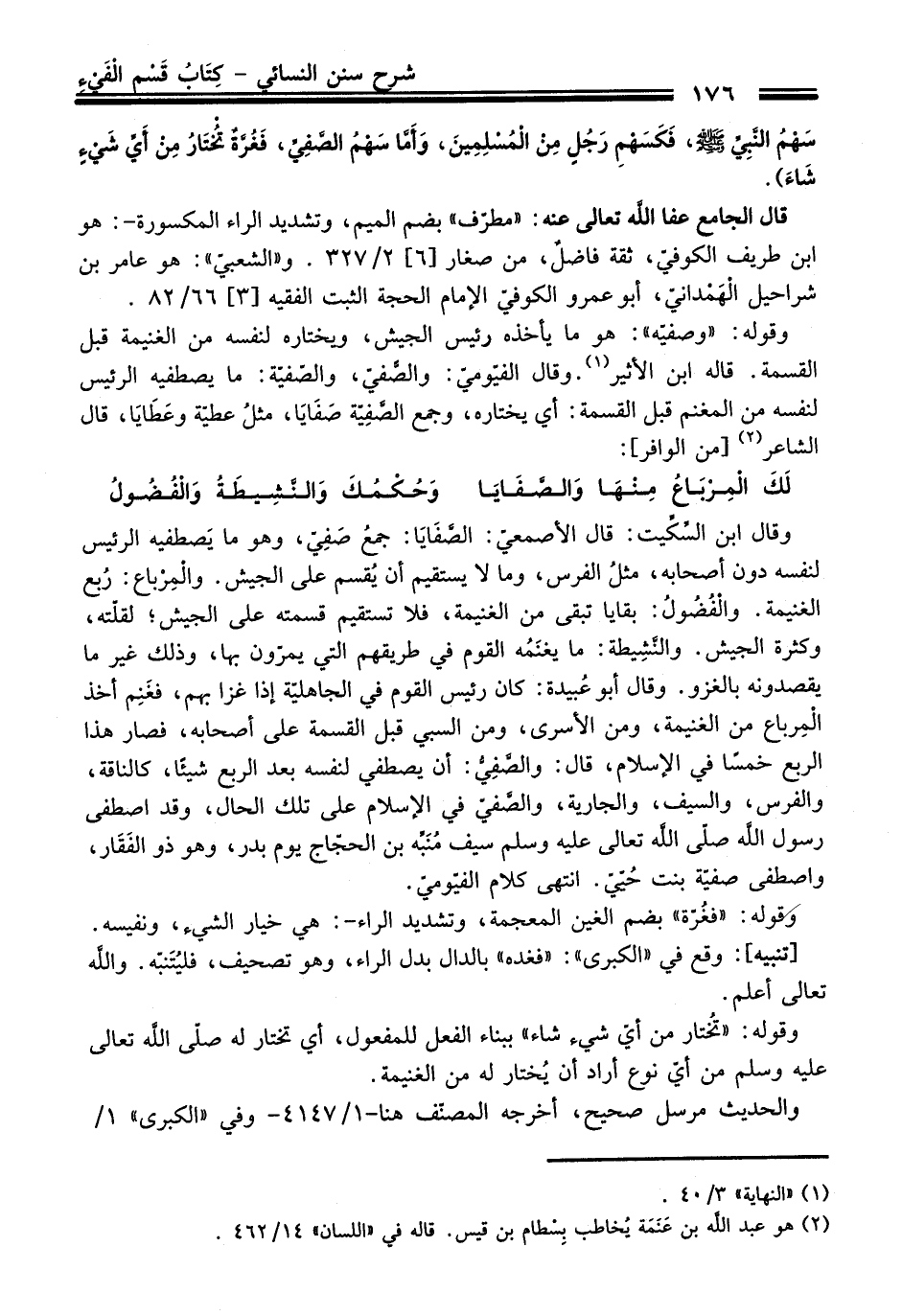 سَهْمُ النَّبِيِّ - صلى اللَّه عليه وسلم -, فَكَسَهْمِ رَجُلٍ مِنَ الْمُسْلِمِينَ, وَأَمَّا سَهْمُ الصَّفِيِّ, فَغُرَّةٌ تُخْتَارُ مِنْ أَىِّ شَيْءٍ شَاءَ).