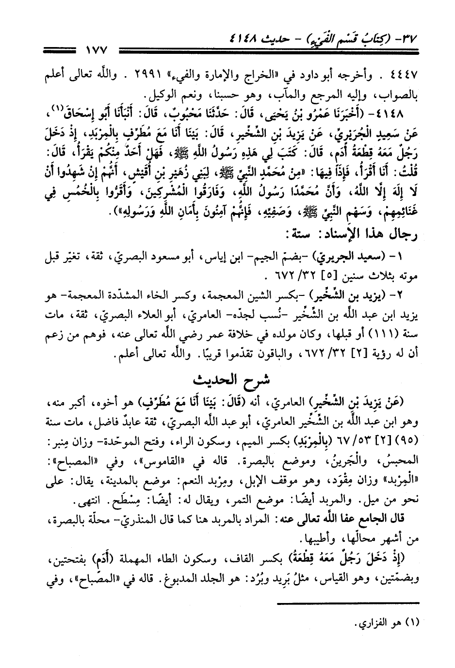 4148 - (أَخْبَرَنَا عَمْرُو بْنُ يَحْيَى, قَالَ: حَدَّثَنَا مَحْبُوبٌ, قَالَ: أَنْبَأَنَا أَبُو إِسْحَاقَ (¬1) , عَنْ سَعِيدٍ الْجُرَيْرِيِّ, عَنْ يَزِيدَ بْنِ الشِّخِّيرِ, قَالَ: بَيْنَا أَنَا مَعَ مُطَرِّفٍ بِالْمِرْبَدِ, إِذْ دَخَلَ رَجُلٌ مَعَهُ قِطْعَةُ أُدْمٍ, قَالَ: كَتَبَ لِي هَذِهِ رَسُولُ اللَّهِ - صلى اللَّه عليه وسلم -, فَهَلْ أَحَدٌ مِنْكُمْ يَقْرَأُ, قَالَ: قُلْتُ: أَنَا أَقْرَأُ, فَإِذَا فِيهَا: «مِنْ مُحَمَّدٍ النَّبِيِّ - صلى اللَّه عليه وسلم -, لِبَنِي زُهَيْرِ بْنِ أُقَيْشٍ, أَنَّهُمْ إِنْ شَهِدُوا أَنْ لاَ إِلَهَ إِلاَّ اللَّهُ, وَأَنَّ مُحَمَّدًا رَسُولُ اللَّهِ, وَفَارَقُوا الْمُشْرِكِينَ, وَأَقَرُّوا بِالْخُمُسِ فِي غَنَائِمِهِمْ, وَسَهْمِ النَّبِيِّ - صلى اللَّه عليه وسلم -, وَصَفِيِّهِ, فَإِنَّهُمْ آمِنُونَ بِأَمَانِ اللَّهِ وَرَسُولِهِ»).