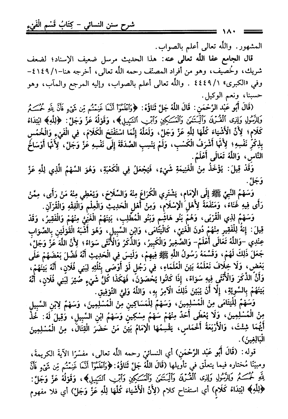 قَالَ أَبُو عَبْدِ الرَّحْمَنِ: قَالَ: اللَّهُ جَلَّ ثَنَاؤُهُ: {وَاعْلَمُوا أَنَّمَا غَنِمْتُمْ مِنْ شَيْءٍ فَأَنَّ لِلَّهِ خُمُسَهُ وَلِلرَّسُولِ وَلِذِى الْقُرْبَى وَالْيَتَامَى وَالْمَسَاكِينِ وَابْنِ السَّبِيلِ} وَقَوْلُهُ -عَزَّ وَجَلَّ-: {لِلَّهِ} ابْتِدَاءُ كَلاَمٍ؛ لأَنَّ الأَشْيَاءَ كُلَّهَا لِلَّهِ -عَزَّ وَجَلَّ-, وَلَعَلَّهُ إِنَّمَا اسْتَفْتَحَ الْكَلاَمَ, فِي الْفَىْءِ وَالْخُمُسِ بِذِكْرِ نَفْسِهِ, لأَنَّهَا أَشْرَفُ الْكَسْبِ, وَلَمْ يَنْسُبِ الصَّدَقَةَ إِلَى نَفْسِهِ -عَزَّ وَجَلَّ-, لأَنَّهَا أَوْسَاخُ النَّاسِ, وَاللَّهُ تَعَالَى أَعْلَمُ وَقَدْ قِيلَ: يُؤْخَذُ مِنَ الْغَنِيمَةِ شَيْءٌ, فَيُجْعَلُ فِي الْكَعْبَةِ, وَهُوَ السَّهْمُ الَّذِي لِلَّهِ -عَزَّ وَجَلَّ-.