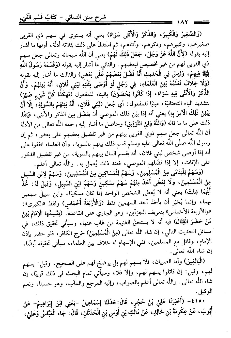 (وَسَهْمٌ لِليَتَامَى مِنْ الْمُسْلِمِينَ، وَسَهْمٌ لِلْمَسَاكِينِ مِنْ الْمُسْلِمِينَ، وَسَهْمٌ لِابْنِ السَّبِيل مِنْ الْمُسْلِمِينَ، وَلَا يُعْطَى أَحَدٌ مِنْهُمْ سَهْمُ مِسْكِينِ وَسَهْمُ ابْنِ السَّبِيلِ، وَقِيلَ لَهُ: خُذْ أَيُّهُمَا شِئْتَ) يعني أنه لا يُعطى الشخص الواحد إذا كان مسكينا، وابن سبيل سهمين بهما، وإنما يُخير أن يأخد أحد السهمين فقط (وَالأَرْبَعَةُ أَخْمَاسٍ) ولفظ "الكبرى": "والأربعة الأخماس" بتعريف الجزأين، وهو الجاري على القاعدة. (يَقْسِمُها الإِمَامُ بَيْنَ مَنْ حَضَرَ القِتَالَ) فيه أنه لا يستحق الغنيمة من غاب عنها، وسيأتي تحقيق ذلك، في مسائل الحديث التالي، إن شاء اللَّه تعالى (مِنْ الْمُسْلِمِينَ) خرج الكافر، فلو حضر بإذن الإمام، وقاتل مع المسلمين، ففي الإسهام له خلاف بين العلماء، سيأتي تحقيقه أيضًا، إن شاء اللَّه تعالى.