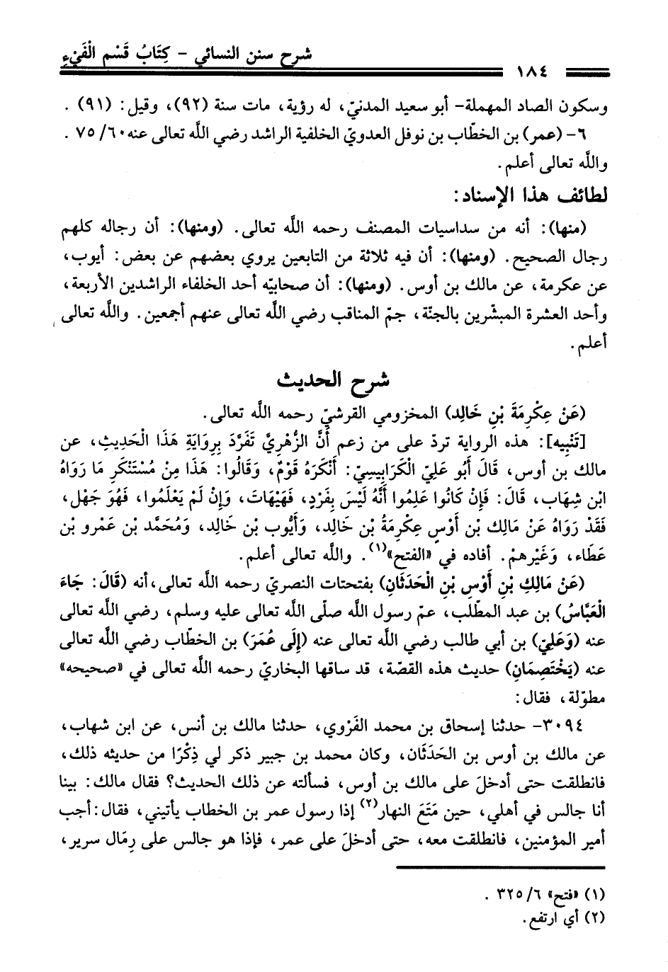 (عَنْ مَالِكِ بْنِ أَوْسِ بْنِ الْحَدَثَانِ) بفتحتات النصريّ -رحمه اللَّه تعالى-، أنه (قَالَ: جَاءَ الْعَبَّاسُ) بن عبد المطّلب، عم رسول اللَّه - صلى اللَّه تعالى عليه وسلم -، - رضي اللَّه تعالى - عنه (وَعَلِيّ) بن أبي طالب - رضي اللَّه تعالى عنه - (إِلَى عُمَرَ) بن الخطاب - رضي اللَّه تعالى - عنه (يَخْتَصِمَانِ) حديث هذه القصّة، قد ساقها البخاريّ -رحمه اللَّه تعالى- في "صحيحه" مطولة، فقال: