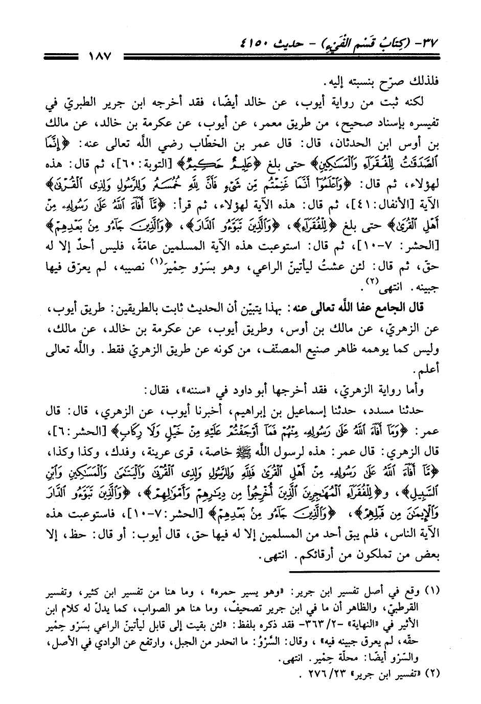 حدثنا مسدد، حدثنا إسماعيل بن إبراهيم، أخبرنا أيوب، عن الزهريّ، قال: قال عمر: {وَمَا أَفَاءَ اللَّهُ عَلَى رَسُولِهِ مِنْهُمْ فَمَا أَوْجَفْتُمْ عَلَيْهِ مِنْ خَيْلٍ وَلَا رِكَابٍ} [الحشر: 6]، قال الزهريّ: قال عمر. هذه لرسول اللَّه - صلى اللَّه عليه وسلم - خاصة، قرى عرينة، وفدك، وكذا وكذا، {مَا أَفَاءَ اللَّهُ عَلَى رَسُولِهِ مِنْ أَهْلِ الْقُرَى فَلِلَّهِ وَلِلرَّسُولِ وَلِذِي الْقُرْبَى وَالْيَتَامَى وَالْمَسَاكِينِ وَابْنِ السَّبِيلِ} , و {لِلْفُقَرَاءِ الْمُهَاجِرِينَ الَّذِينَ أُخْرِجُوا مِنْ دِيَارِهِمْ وَأَمْوَالِهِمْ} , {وَالَّذِينَ تَبَوَّءُوا الدَّارَ وَالْإِيمَانَ مِنْ قَبْلِهِمْ} , {وَالَّذِينَ جَاءُوا مِنْ بَعْدِهِمْ} [الحشر:7 - 10] , فاستوعبت هذه الآية الناس، فلم يبق أحد من المسلمين إلا له فيها حقّ، قال أيوب: أو قال: حظ، إلا بعض من تملكون من أرقائكم. انتهى.