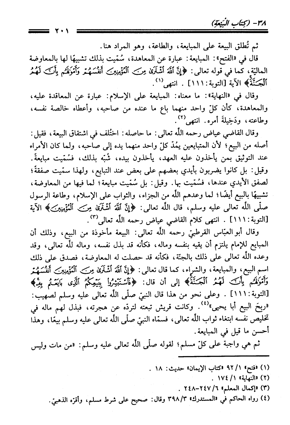 وَقَالَ فِي "النهاية": ما معناه: المبايعة عَلَى الإِسلام: عبارة عن المعاقدة عليه، والمعاهدة، كأن كلّ واحد منهما باع ما عنده منْ صاحبه، وأعطاه خالصة نفسه، وطاعته، ودَخِيلةَ أمره. انتهى (¬2).