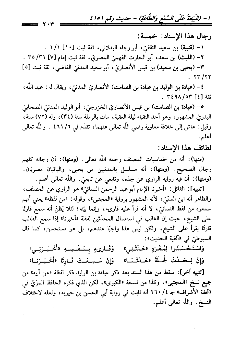 [تنبيه آخر]: سقط منْ هذا السند بعد ذكر عبادة بن الوليد ذكر لفظة "عن أبيه" منْ جميع نسخ "المجتبى"، وكذا منْ نسخة "الكبرى"، لكن الذي ذكره الحافظ المزّيّ فِي "تحفة الأشراف" جـ 4/ 260 أنه ثابت فِي رواية أبي الحسن بن حيويه، ولعله لاختلاف النسخ. والله تعالى أعلم.