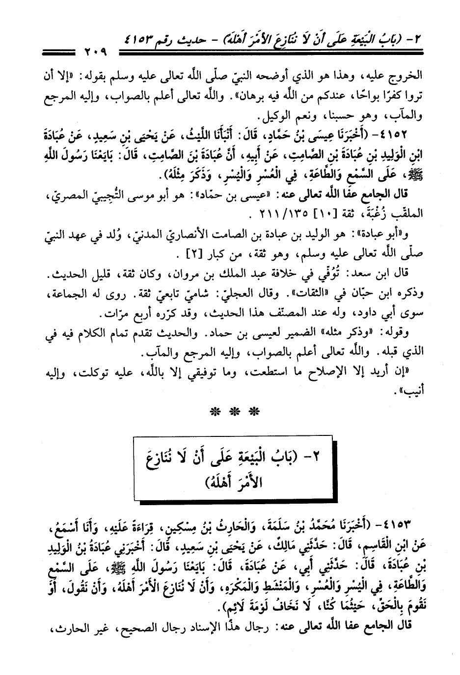 4152 - (أَخْبَرَنَا عِيسَى بْنُ حَمَّادٍ، قَالَ: أَنْبَأَنَا اللَّيْثُ، عَنْ يَحْيَى بْنِ سَعِيدٍ، عَنْ عُبَادَةَ بْنِ الْوَلِيدِ بْنِ عُبَادَةَ بْنِ الصَّامِتِ، عَنْ أَبِيهِ، أَنَّ عُبَادَةَ بْنَ الصَّامِتِ، قَالَ: بَايَعْنَا رَسُولَ اللَّهِ -صلى الله عليه وسلم-، عَلَى السَّمْعِ وَالطَّاعَةِ، فِي الْعُسْرِ وَالْيُسْرِ، وَذَكَرَ مِثْلَهُ).