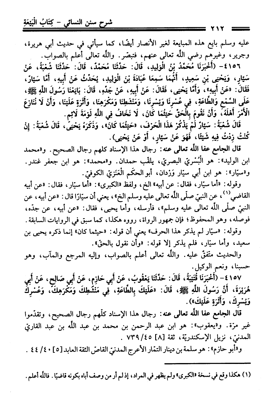 4156 - (أَخْبَرَنَا مُحَمَّدُ بْنُ الْوَلِيدِ، قَالَ: حَدَّثَنَا مُحَمَّدٌ، قَالَ: حَدَّثَنَا شُعْبَةُ، عَنْ سَيَّارٍ، وَيَحْيَى بْنِ سَعِيدٍ، أَنَّهُمَا سَمِعَا عُبَادَةَ بْنَ الْوَلِيدِ، يُحَدِّثُ عَنْ أَبِيهِ، أَمَّا سَيَّارٌ، فَقَالَ: "عَنْ أَبِيهِ"، وَأَمَّا يَحْيَى، فَقَالَ: عَنْ أَبِيهِ، عَنْ جَدِّهِ، قَالَ: بَايَعْنَا رَسُولَ اللَّهِ -صلى الله عليه وسلم-، عَلَى السَّمْعِ وَالطَّاعَةِ، فِي عُسْرِنَا وَيُسْرِنَا، وَمَنْشَطِنَا وَمَكْرَهِنَا، وَأَثَرَةٍ عَلَيْنَا، وَأَنْ لاَ نُنَازِعَ الأَمْرَ أَهْلَهُ، وَأَنْ نَقُومَ بِالْحَقِّ حَيْثُمَا كَانَ، لاَ نَخَافُ فِي اللَّهِ لَوْمَةَ لاَئِمٍ.