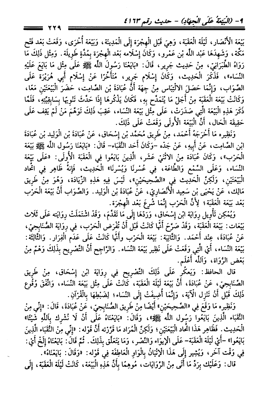 بيعة الأنصار، ليلة العقبة، وهِي قبل الهِجرة إِلى المدِينة، وبيعة أُخرى، وقعت بعد فتح مكّة، وشهِدها عبد الله بن عمرو، وكان إِسلامه بعد الهِجرة بِمُدةٍ طوِيلة. ومِثل ذَلِكَ ما رواهُ الطبرانِي، منْ حدِيث جرِير، قَالَ: "بايعنا رسُول الله -صلى الله عليه وسلم- عَلَى مِثل ما بايع عَلَيْهِ النِّساء"، فذكر الحديث، وكان إسلام جرير، مُتأخِّرًا عن إسلام أبي هريرة عَلَى الصَّواب، واِنما حصل الالتِباس منْ جِهة أن عُبادة بن الصامِت، حضر البيعتينِ معًا، وكانت بيعة العقبة منْ أجَلّ ما يُتمدَّح بِهِ، فَكَان يذكُرها إِذَا حدَّث تنوِيها بِسابِقِيَّتِهِ، فلمّا ذكر هذِهِ البيعة الَّتِي صدرت، عَلَى مِثل بيعة النِّسَاء، عقِب ذَلِكَ توهَّم منْ لم يقِف عَلَى حقِيقة الْحال، أن البيعة الأُولى وقعت عَلَى ذَلِكَ.