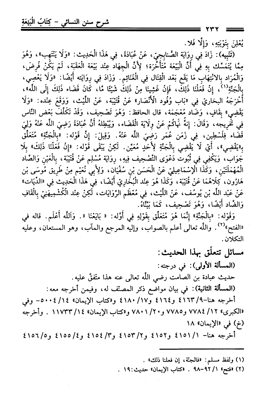 وقؤله: "بالجنة" إِنما هُو مُتعلِّق بِقولِهِ فِي أوَّله: "بايعنا". والله أعلم. قاله فِي "الفتح" (¬2). والله تعالى أعلم بالصواب، وإليه المرجع والمآب، وهو المستعان، وعليه التكلان.