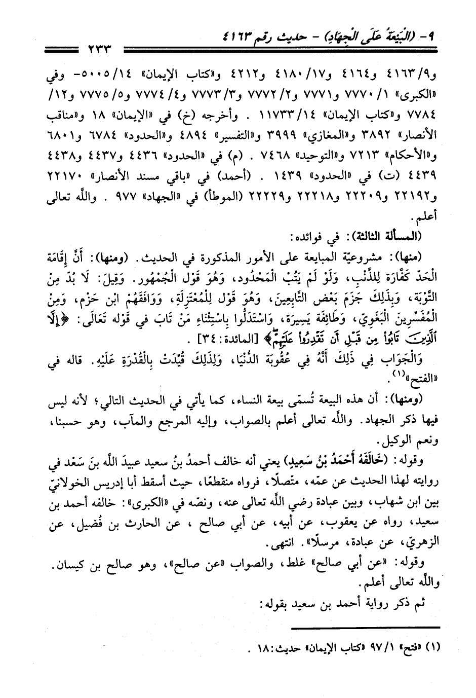 (منها): مشروعية المبايعة عَلَى الأمور المذكورة فِي الحديث. (ومنها): أن إِقامة الحدّ كفَّارة لِلذَّنبِ، ولو لم يتُب المحدُود، وهُو قول الجُمهُور. وقِيل: لابُد منْ التوبة، وبِذلِك جزم بعض التابِعِين، وهُو قول لِلمُعتزِلةِ، ووافقهُم ابن حزم، ومن المفسرِين البغوِيّ، وطائِفة يسِيرة، واستدلُوا بِاسْتِثَناءِ منْ تاب فِي قوله تعالى: {إِلَّا الَّذِينَ تَابُوا مِنْ قَبْلِ أَنْ تَقْدِرُوا عَلَيْهِمْ} [المائدة: 34].