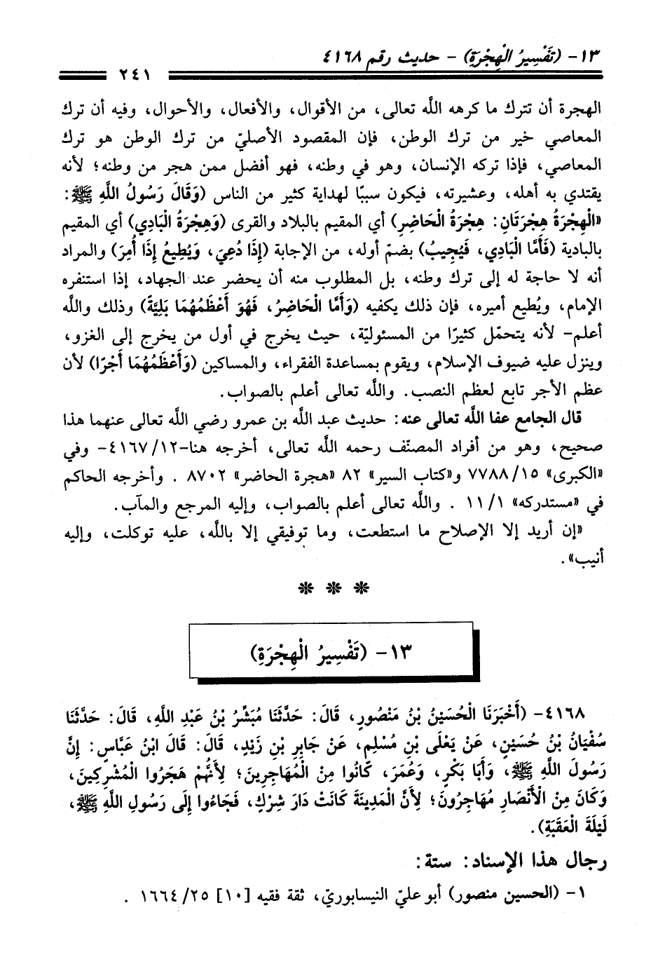 قَالَ الجامع عفا الله تعالى عنه: حديث عبد الله بن عمرو رضي الله تعالى عنهما هَذَا صحيح، وهو منْ أفراد المصنّف رحمه الله تعالى، أخرجه هنا -12/ 4167 - وفي "الكبرى" 15/ 7788 و"كتاب السير" 82 "هجرة الحاضر" 8702. وأخرجه الحاكم فِي "مستدركه" 1/ 11. والله تعالى أعلم بالصواب، وإليه المرجع والمآب.